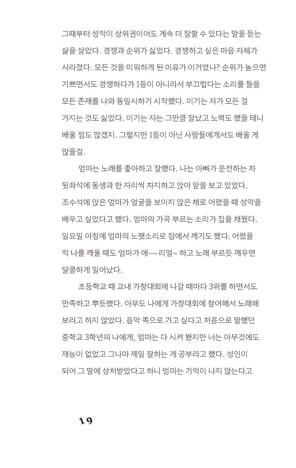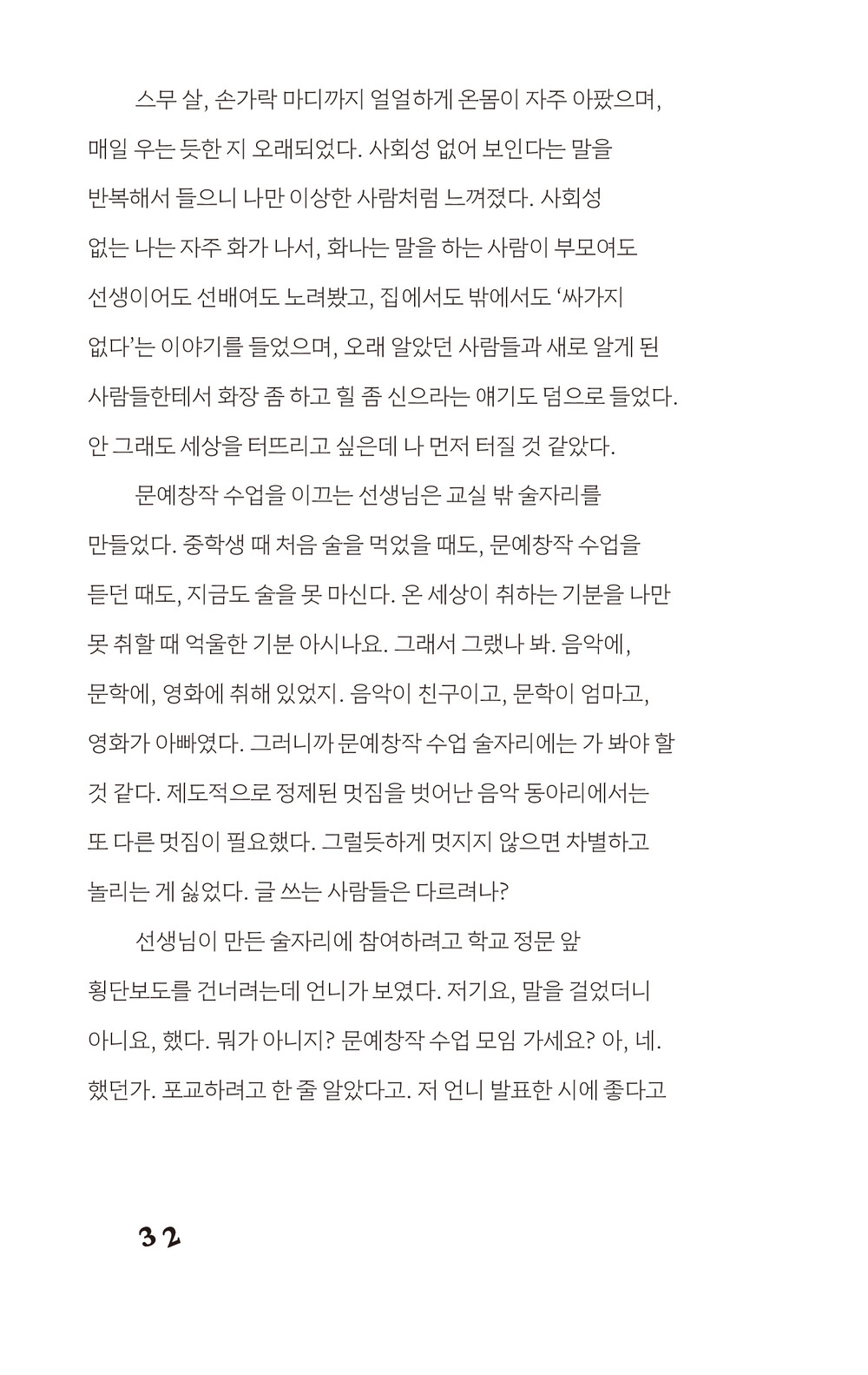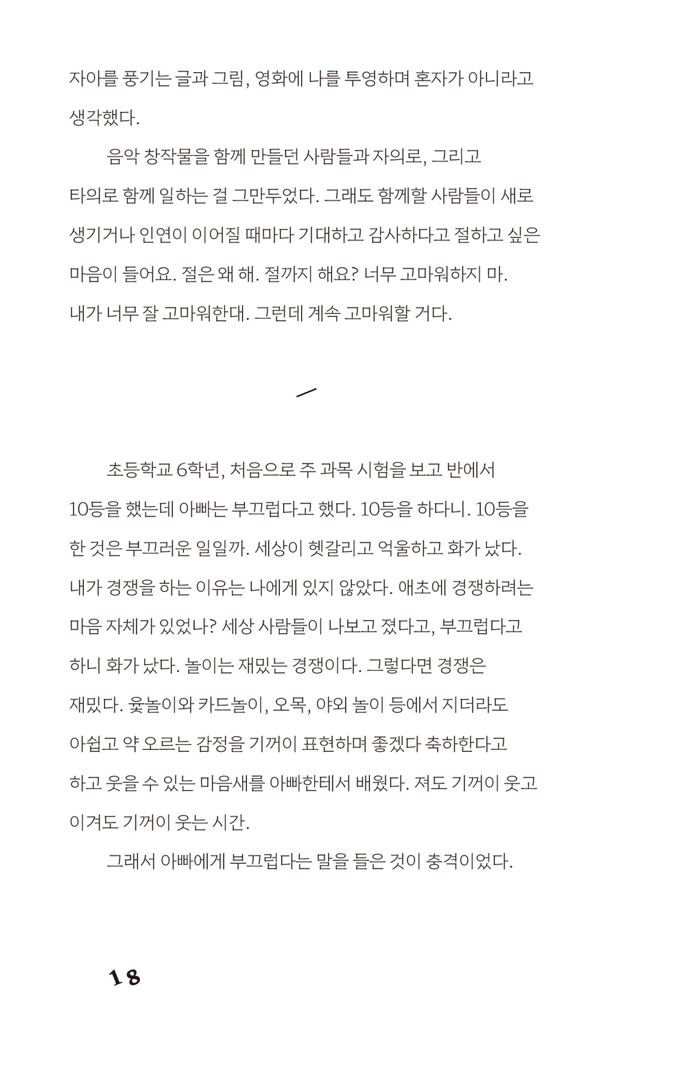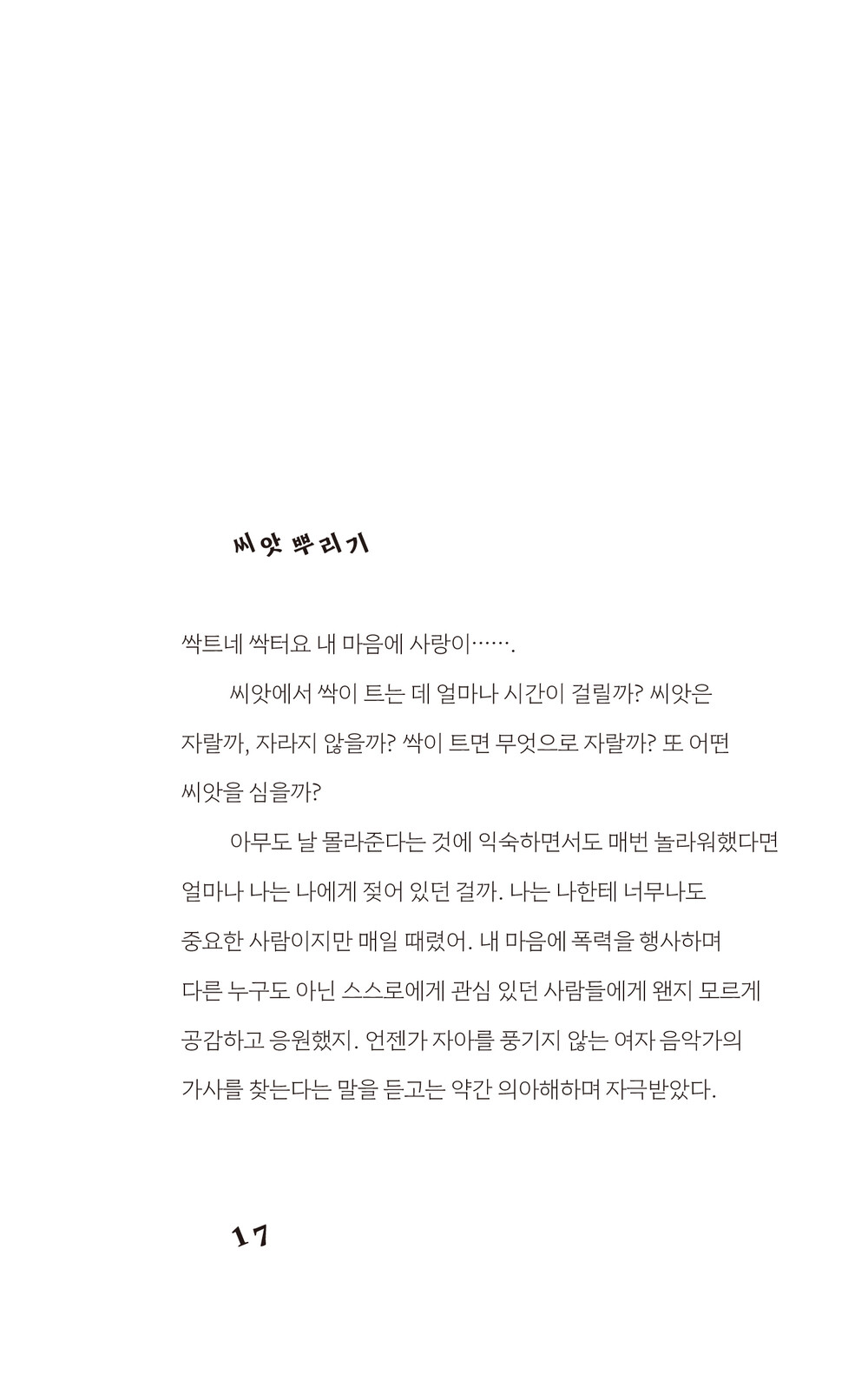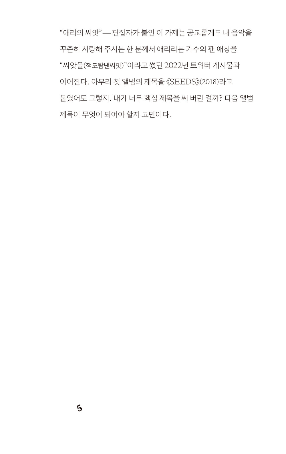애리의 산문은 여러 겹으로 쌓인 그의 음악처럼 기묘한 리듬으로 가득하다. 누군가와의 대화처럼 읽히다가도 혼잣말로 들린다. 가까운 과거의 이야기를 풀어놓다가 먼 과거로 훌쩍 넘어간다. 독자에게 문득 직접 말을 건네기도 한다.
