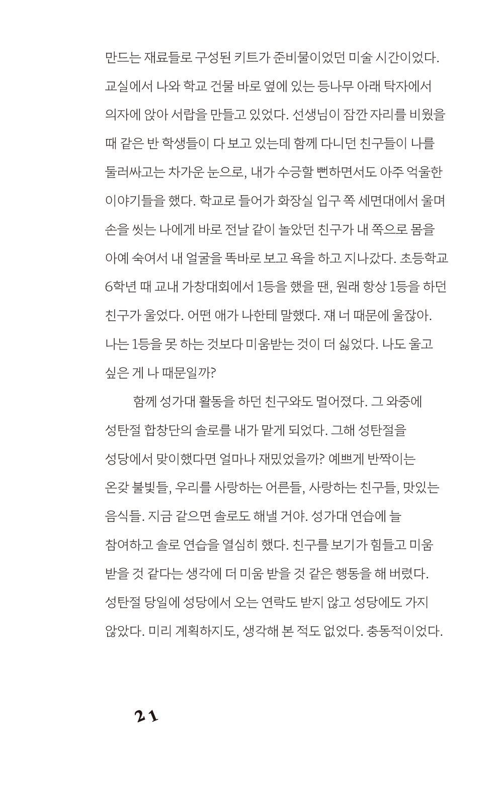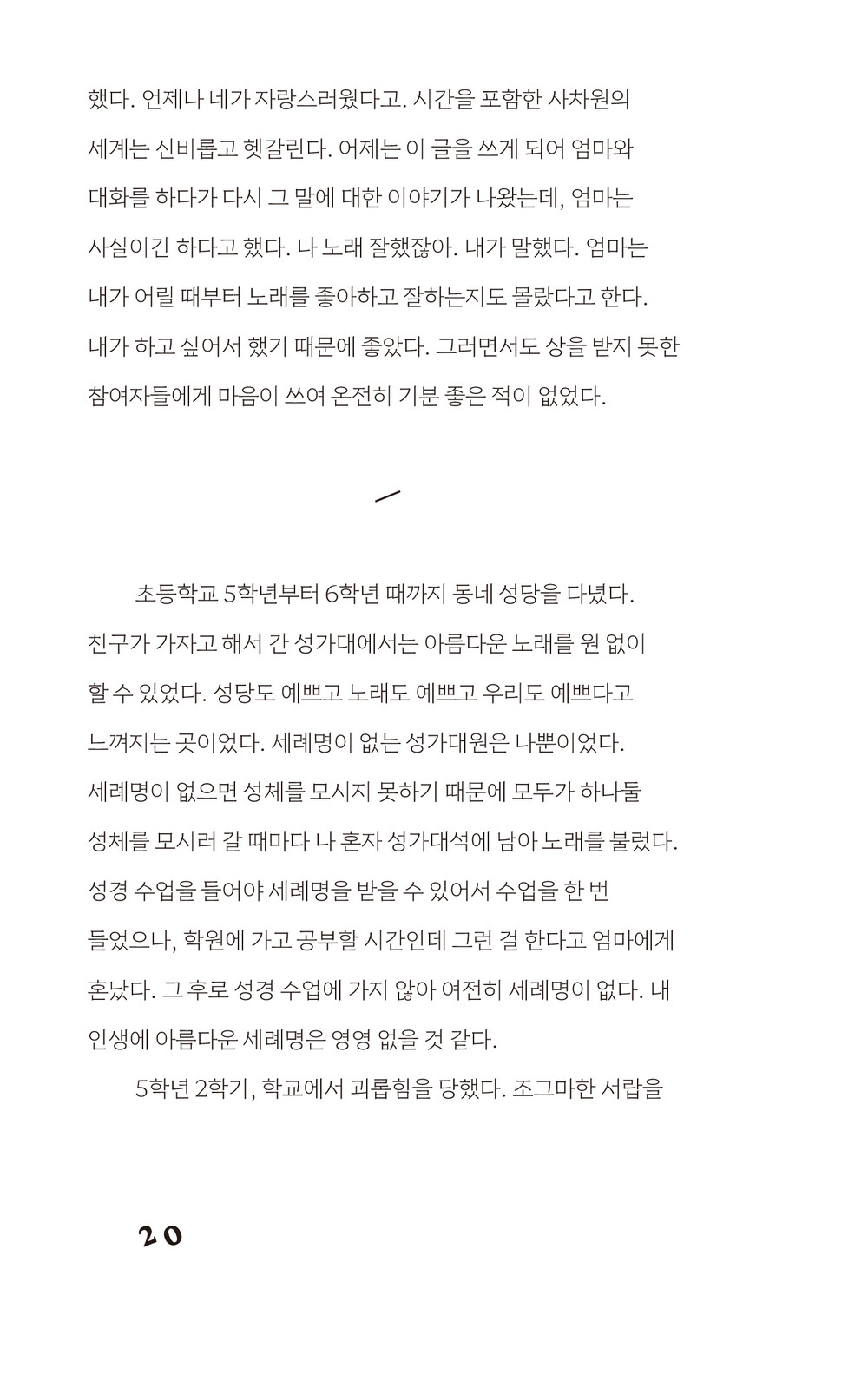 과거의 앨범에 담긴 이야기를 쓰다 보니 과거의 나 자신과 자주 마주치며 아프기도 했고, 이런 이야기를 써도 될지 두렵기도 했습니다.……하지만 글을 쓰면서도, 교정을 보면서도, 다시 떠올립니다. 내 마음이 이랬구나. 이 모든 일들을 지나왔고, 현재를 지나고 있고, 앞으로도 많은 일들을 겪겠구나. 사랑하고 사랑받고 싶구나. (“서[序]”에서)