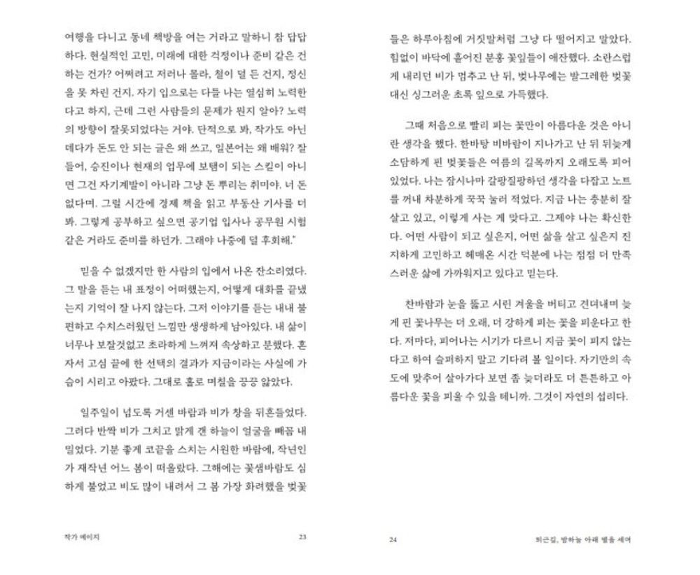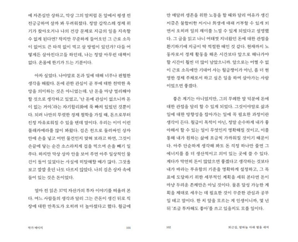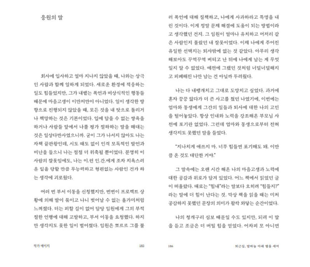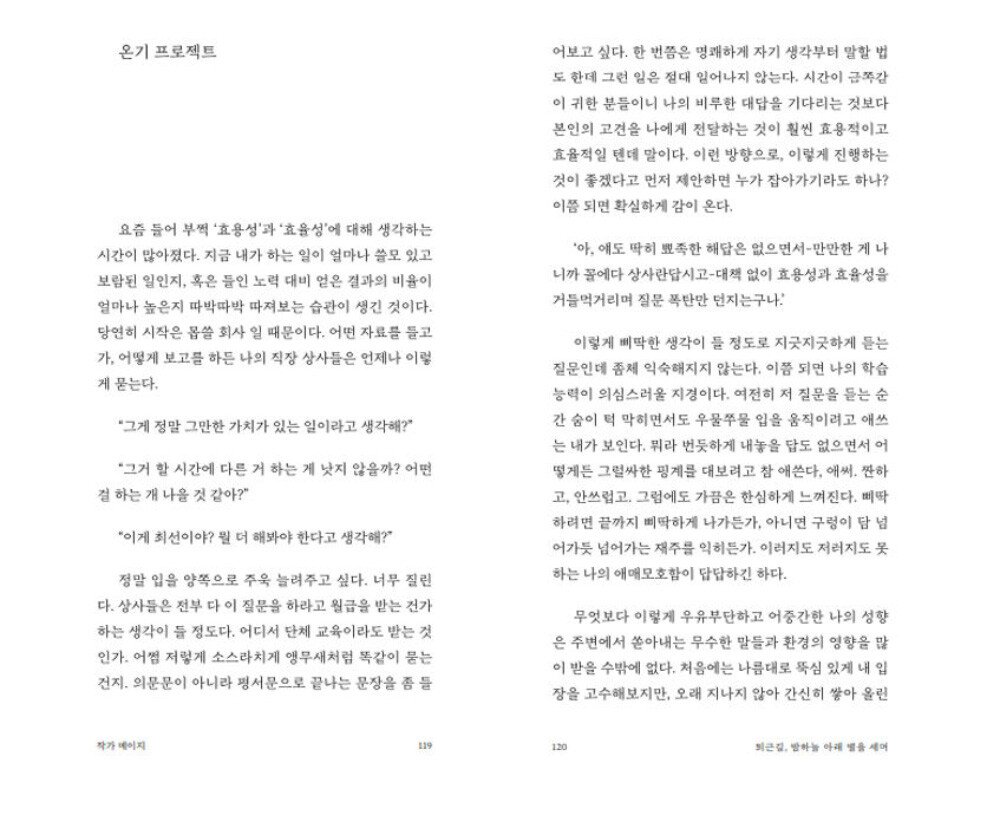 엄한 선배의 뒤꽁무니를 쫓아 다니며 일을 배우기 시작한 게 오래되지 않은 것 같은데, 벌써 7년 차 직장인이 되었습니다. 수십 년의 직장 생활을 해내신 분들에 비하면 너무나 보잘것없는 경력이지만, 매사 적응이 느린 저에게는 입사 후 초반 3~4년까지가 너무나 힘든 시기였습니다. 사회에 첫발을 내디뎌 회사라는 새로운 시스템에 적응하는 일도, 세대와 성격과 취향이 다른 사람들이 만나 하루의 대부분을 함께 보낸다는 사실도 너무나 어렵고 버겁기만 했습니다. 그냥 회사원이 적성이 아닌가 싶다가도 혹시 나만 사회의 부적응자인가 싶어 고민하는 날도 많았어요. 여전히 이러한 문제들에 대해 단호하고 명쾌한 해답을 찾진 못했지만, 적어도 저의 경험을 바탕으로 힘겨워하는 누군가에게 공감과 위로는 건넬 수 있을 정도로 마음의 여유가 생긴 것 같아요. 그래서 지금 당신이 마주하고 있는 걱정과 고민이 오래전부터 누구나 해왔던 것이고, 한 계단씩 올라가기 위해 누구나 거쳐야 하는 과정이었음을 알려주고 싶습니다. 때로는 백 마디 조언의 말보다 앞서 걸어간 사람의 경험담에 마음이 놓이고, 다시 일어날 용기를 얻곤 하니까요. 더불어 특별하진 않지만, 행복을, 빛나는 순간을 찾기 위해 노력하는 저의 일상을 함께 나누며, 당신이 매일 지루하다 느낄지도 모를 그 일상에서 멋진 순간들을 찾아내고 기쁨을 누렸으면 좋겠습니다.