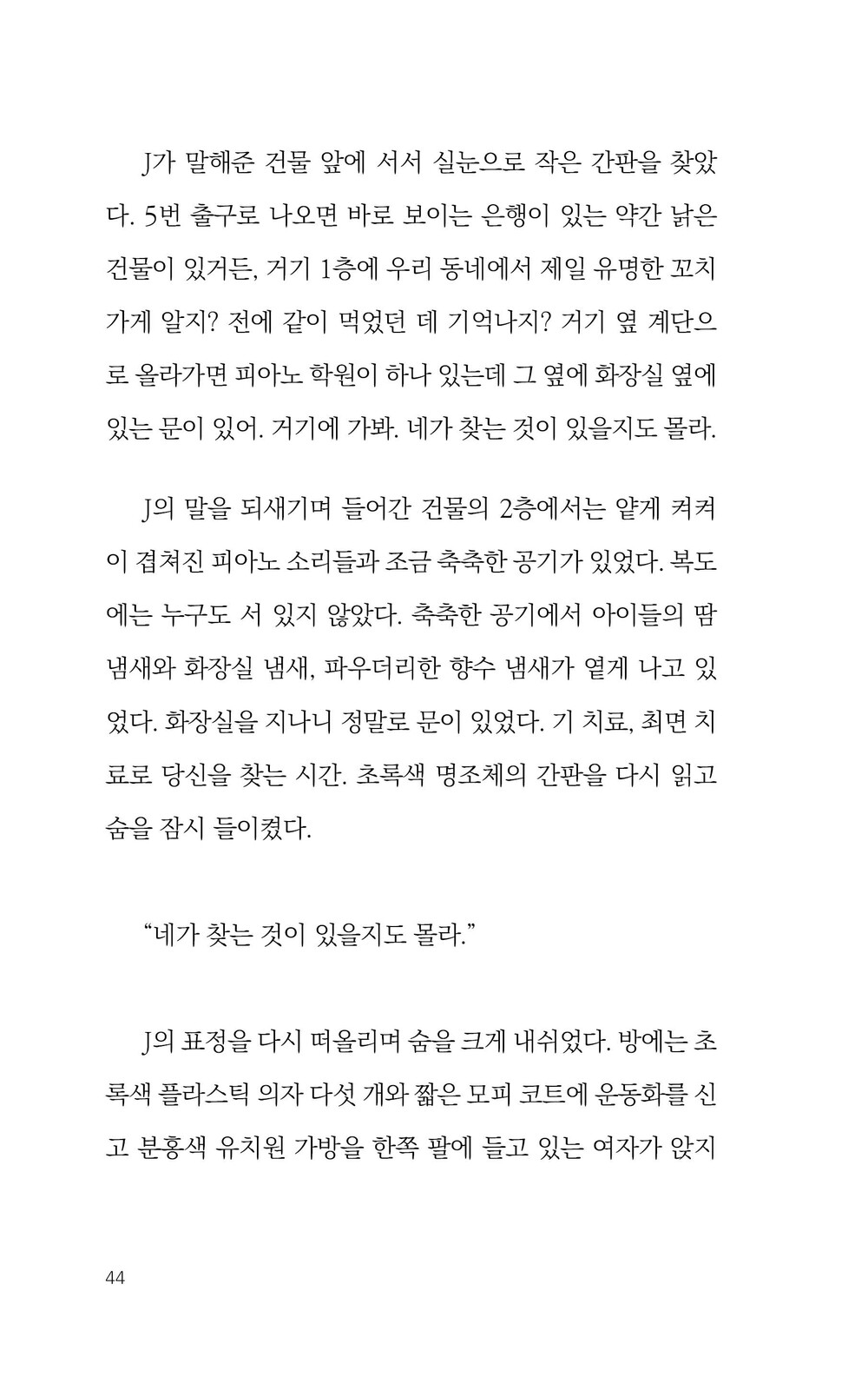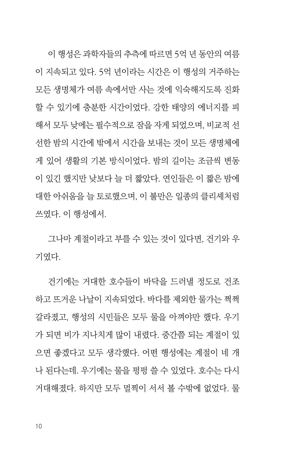 이 책은 공감각적이다. 각 챕터에 들어설 때마다 계절이 바뀌는 경험을 하게 된다. 여름에 목 뒤로 흐르는 땀방울, 가을의 쾌청한 바람, 겨울의 서늘한 공기와 입김, 봄의 아른한 풍경까지. 이 작은 책에서 모두 경험할 수 있다.
