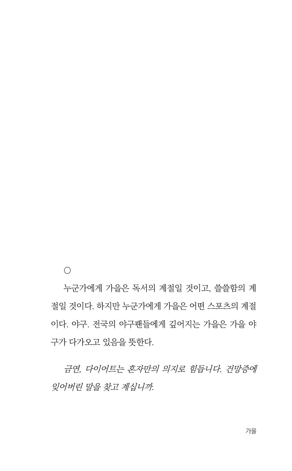 <계절에 대한 감각은 쉽게 공유할 수 있다. 각자가 느끼는 주관적인 심상이 있을 수는 있지만, 우리에게는 분명히 주어지는 공통의 감각이 있다.> 작가의 말 中