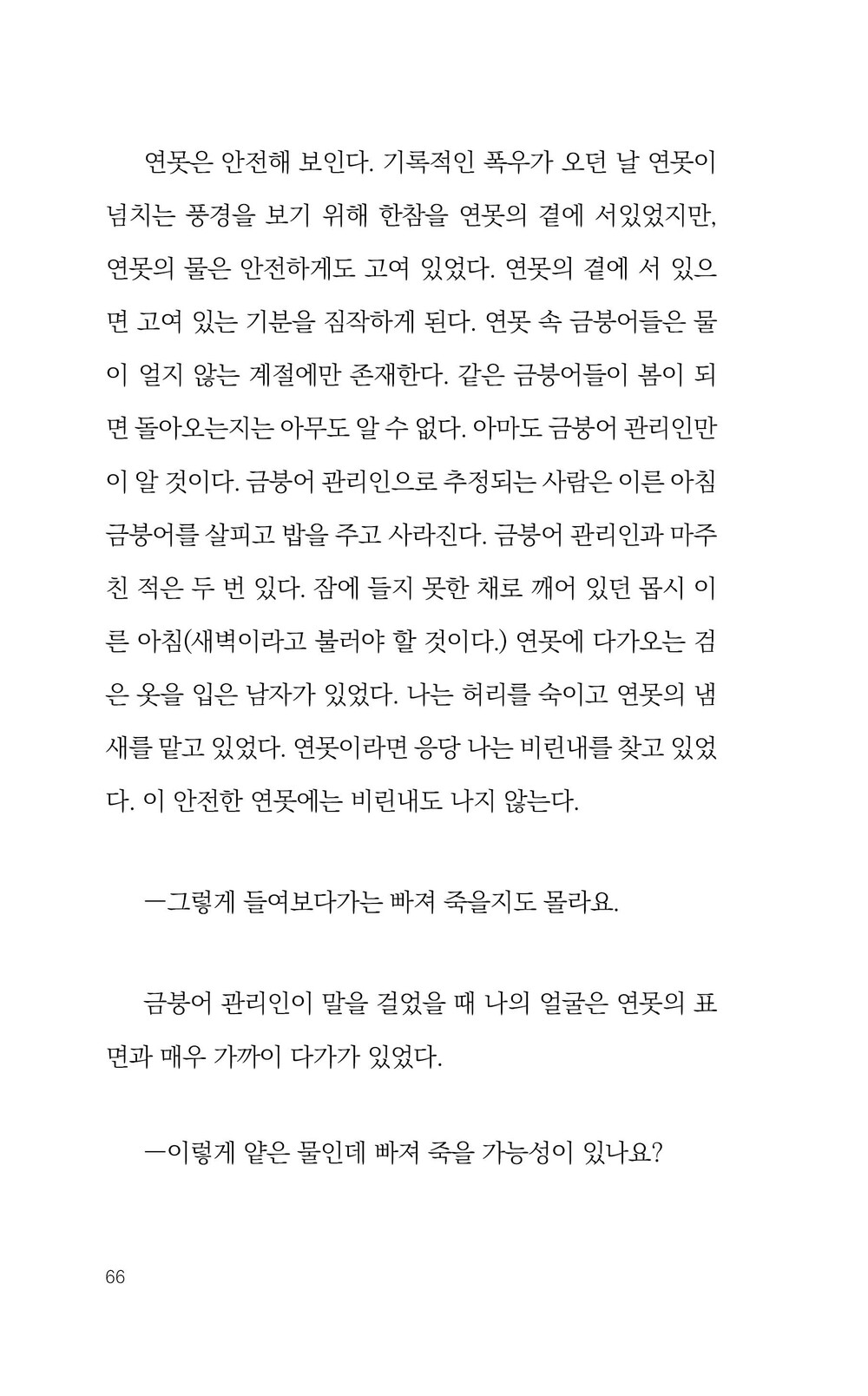 어느 날 집 근처 ‘연못’의 ‘금붕어 관리인’에게 이상한 이야기를 듣는다. 얕은 연못에서도 사람이 빠져 죽는다는 이야기. ‘엄마’와 ‘친구’는 연못을 멀리하라고 하지만 ‘나’는 다시 연못을 들여다보는데….
