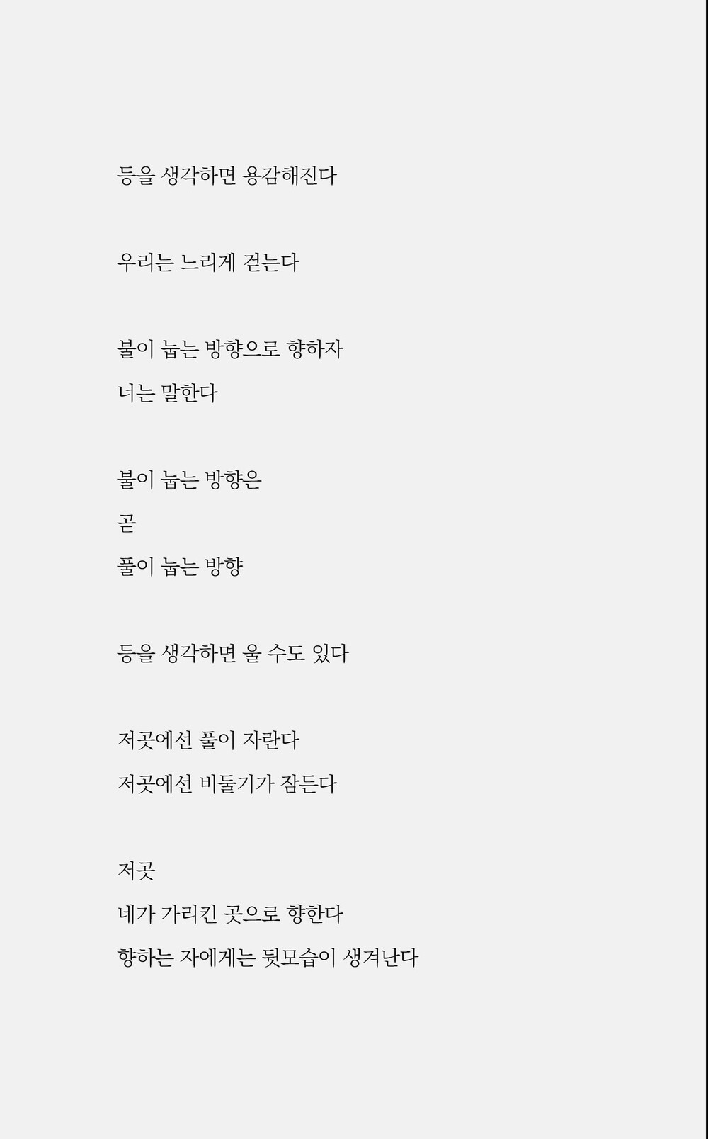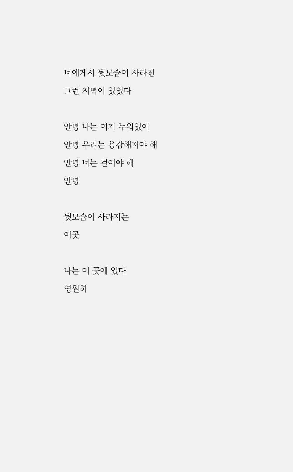 표정은 모래와 같아서 내가 쓰고 싶은 글은 모래의 글, 모래의 책, 사막이 될 것입니다. 《1999년 12월 31일의 조지 해리슨》, 《나는 너의 눈썹을 알고》, 《이름들》, 《표류하는 세계의 극장》을 썼습니다.