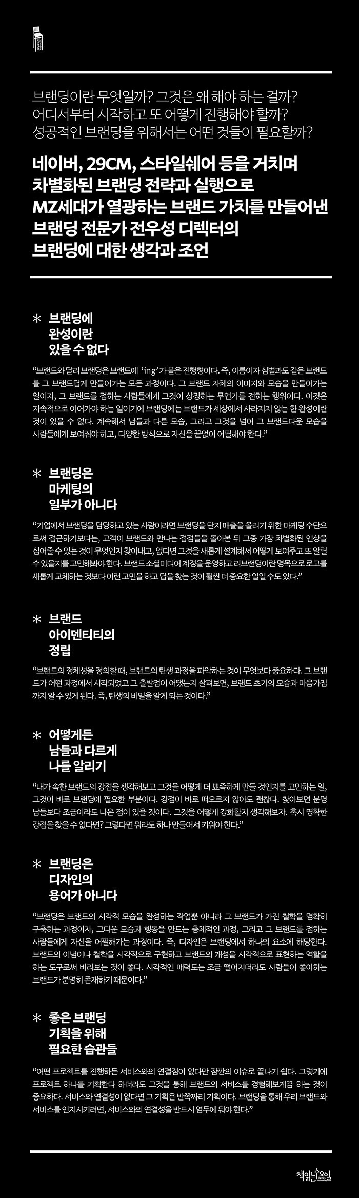 저자는 그 밖에도 ‘노트’라는 형식을 빌려, 고객들에게 마지막 경험이 중요한 이유(p.108), 타기팅(targeting)을 위해 고객 분류 시 인구통계학적 기준이 아닌 취향이나 라이프스타일로 구분하는 방법(p.116), 최대한 많은 직원들에게 브랜드에 관한 일관된 생각을 공유하는 일의 중요성과 그 방법(p.148) 등 그간의 브랜딩 커리어를 거치며 쌓아온 여러 가지 생각들을 풀어냈다. 또한 브랜드 마케터의 조건이나 브랜딩 디렉터의 역할, 좋은 브랜딩 기획을 위해 필요한 습관과 브랜딩 기획 시 피해야 할 부분 등에 대한 이야기를 통해 브랜딩 디렉터로서 갖는 브랜딩에 대한 관점을 다시금 확인할 수 있도록 했다.