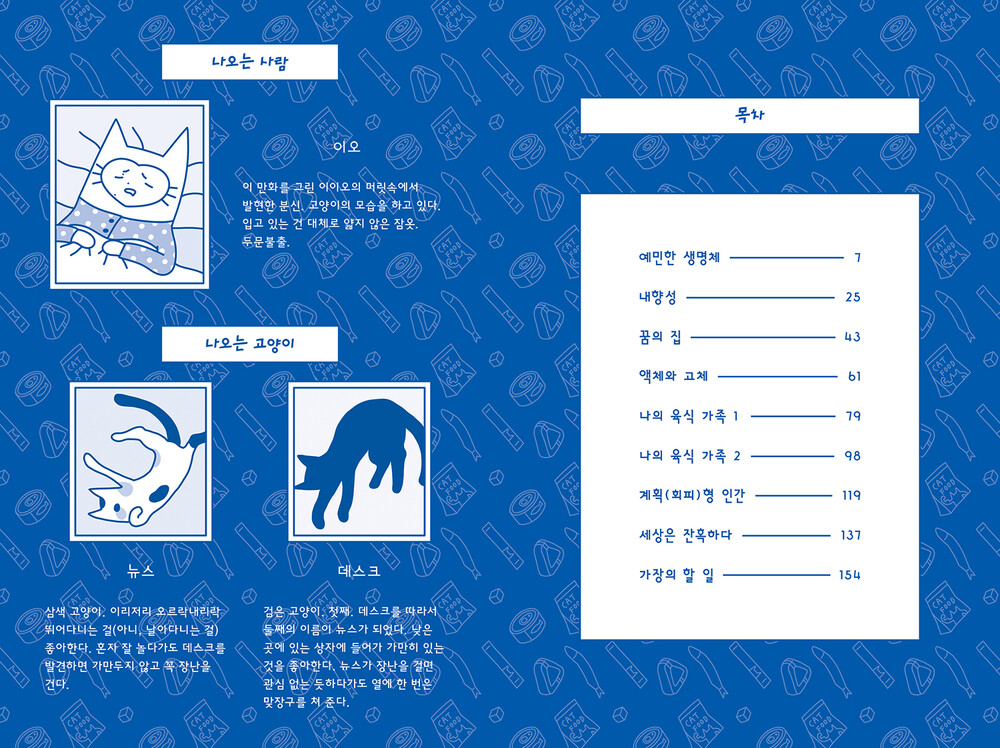 주의! 이 만화는 고양이 만화를 빙자한 한 사람의 일상 넋두리 만화입니다. 고양이들과 함께하는 일상 만화인 것 또한 맞습니다. 고양이 두 마리와 고양이를 닮은 한 사람. 육식하는 주인님들과 채식하는 집사. 관심 없는 이야기일지도 모르지만 고양이의 힘을 빌려 마음속에 담아두었던 말을 꺼내 볼 테니 들어 주시겠습니까?