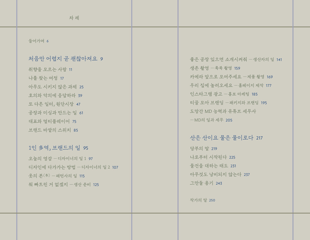 세 번째 챕터 「산은 산이요 물은 물이로다」에서는, 일을 하면서 마주한 현실, 브랜드와 자신 사이에서의 고민, 작지만 큰 깨달음, 스스로 결론지을 수 있었던 지점 등. 두 저자가 그동안 각자의 브랜드를 운영하고 일상을 지내오면서 느꼈던 여러 감정과 생각이 교차하던 날들을 이야기합니다.