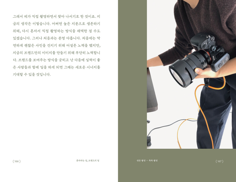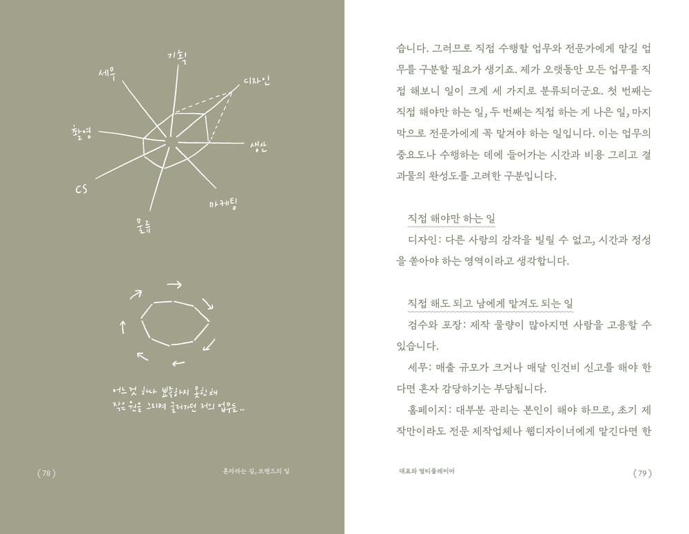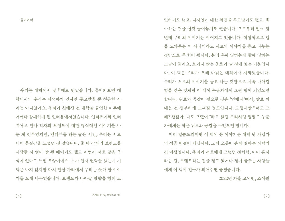 미리 말씀드리지만 이 책에 든 이야기는 대박 난 사업가의 성공 비결이 아닙니다. 그저 오롯이 혼자 일하는 사람의 긴 여정입니다. 우리가 서로에게 그랬던 것처럼, 이미 혼자라는 길, 브랜드라는 길을 걷고 있거나 걷기 꿈꾸는 사람들에게 이 책이 친구가 되어주면 좋겠습니다.