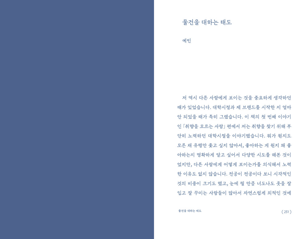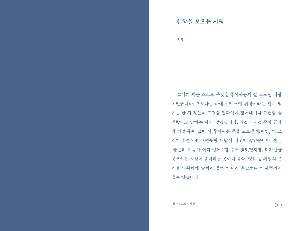 10년이 지난 지금, 그래서 취향이 무엇이냐 물으신다면 “여전히 이런 것도 좋고, 저런 것도 좋아하는데요, 가끔 그런 것도 괜찮게 보이더라고요.”라며 애매하고도 모호한 말을 늘어놓을지 모릅니다. 취향이라는 건 내가 놓인 환경이나 경험에 따라 꾸준히 변하는 것이므로 이제는 애써 설명하지 않습니다. 다만 마음속에 꾸준히 자리 잡아 저를 움직이게 하는 것들이 분명하게 있습니다. 그렇게 손과 발을 움직여 좋아하는 것을 찾고 만든 이야기들을 해보겠습니다.