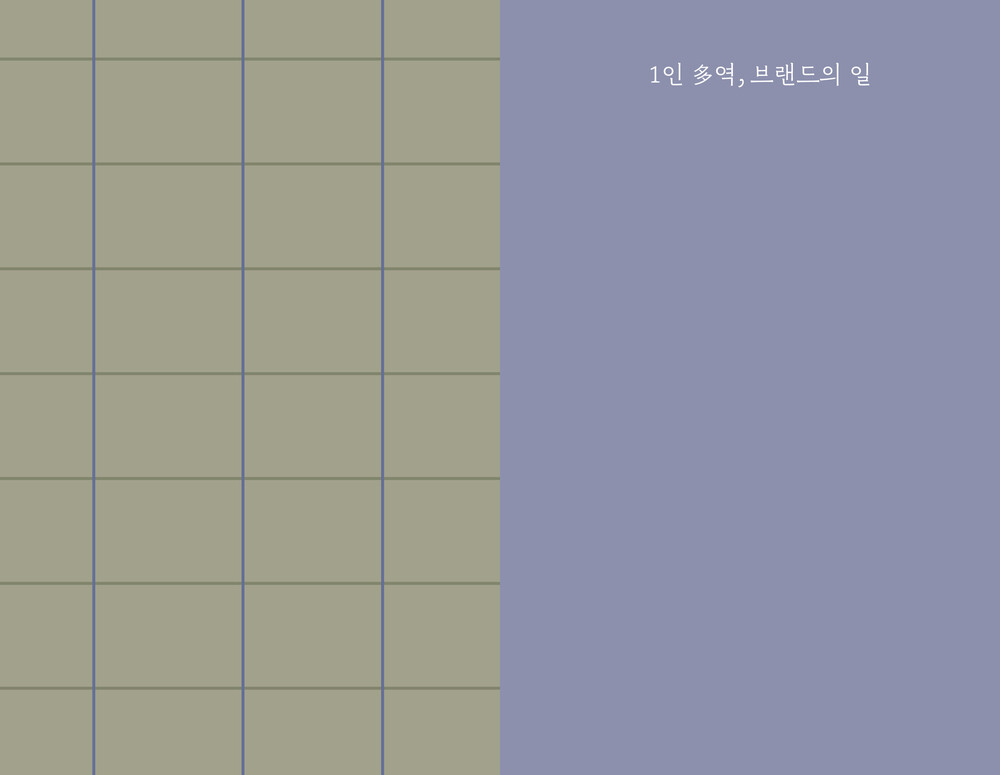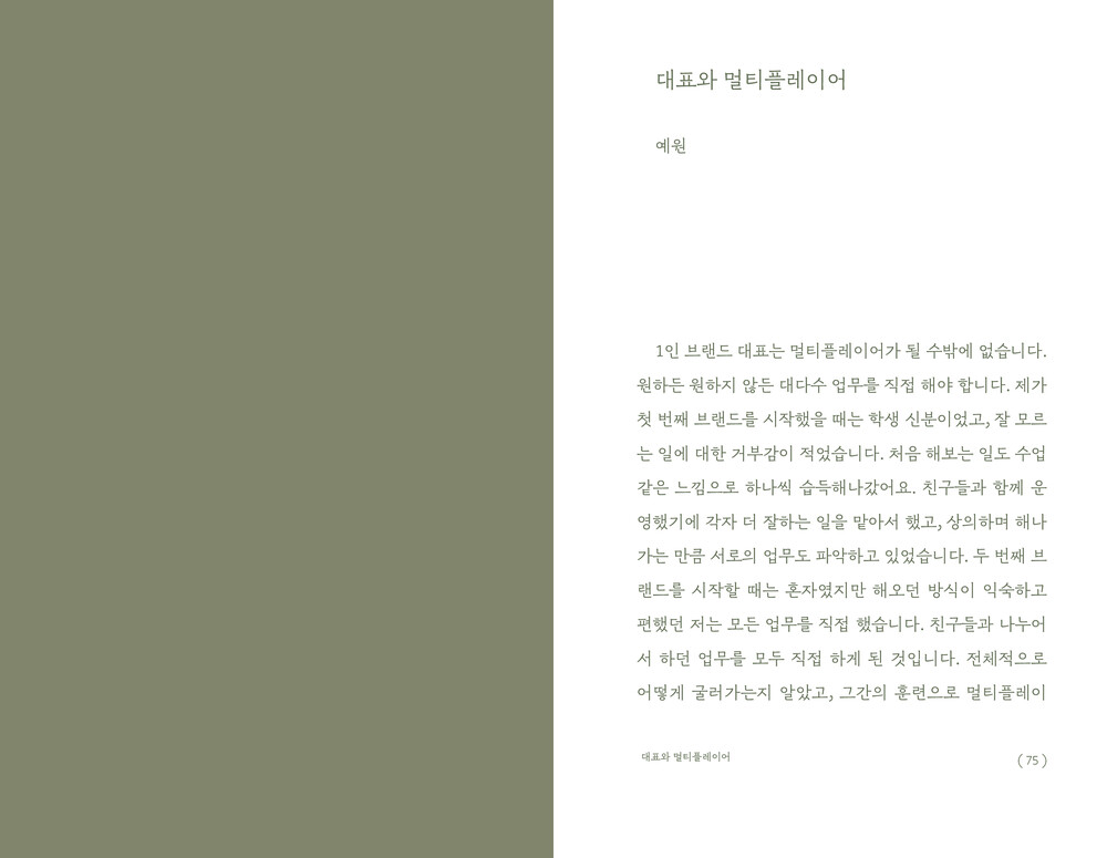 두 번째 챕터 「1인 多역, 브랜드의 일」에서는, 멀티플레이어가 되어 해내는 여러 가지 일을 이야기합니다. 1인 브랜드 운영자라면 온전히 혼자 해야 하는 일도 있고 아닌 일도 있으며, 당연하고 사소한 일도 있고 아닌 일도 있을 텐데요. 여기에서는 보다 실무적인 이야기로 제작자가 겪는 생생한 경험을 나눕니다.