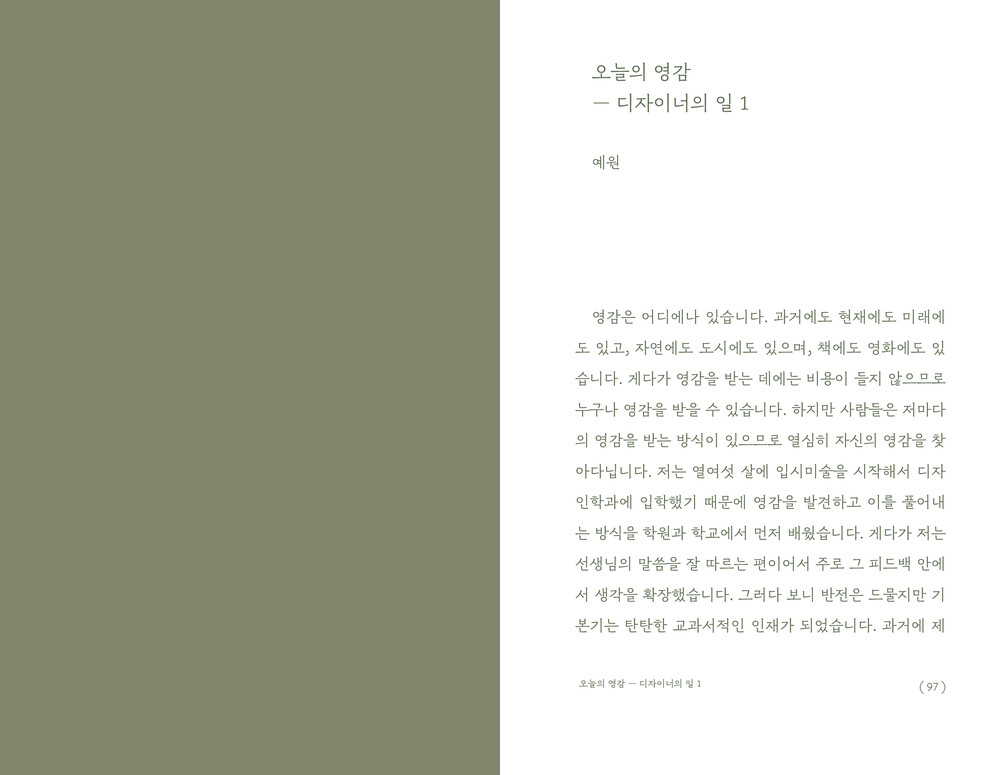 일상에서 영감을 받는다는 말은 돌고 돌아 이렇듯 다시 저에게로 왔습니다. 그때는 와닿지 않던 말이 지금은 무엇보다 중요하게 느껴집니다.