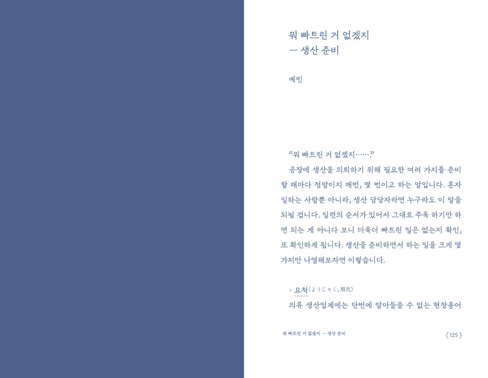 첫 번째 챕터 「처음만 어렵지 곧 괜찮아져요」에서는, 어설프고 어리숙한 시기를 지나 일의 갈피를 잡아가며 익숙해지는 과정을 보여줍니다. 설레는 마음으로 브랜드를 준비하던 지난날, 거래를 시작하기 위해 원단시장과 봉제공장의 문을 두드리던 순간, 웬만한 일을 혼자 다 할 수 있게 된 후에 일과 자신 사이의 균형을 찾기 위해 노력한 순간들을 돌아봅니다.