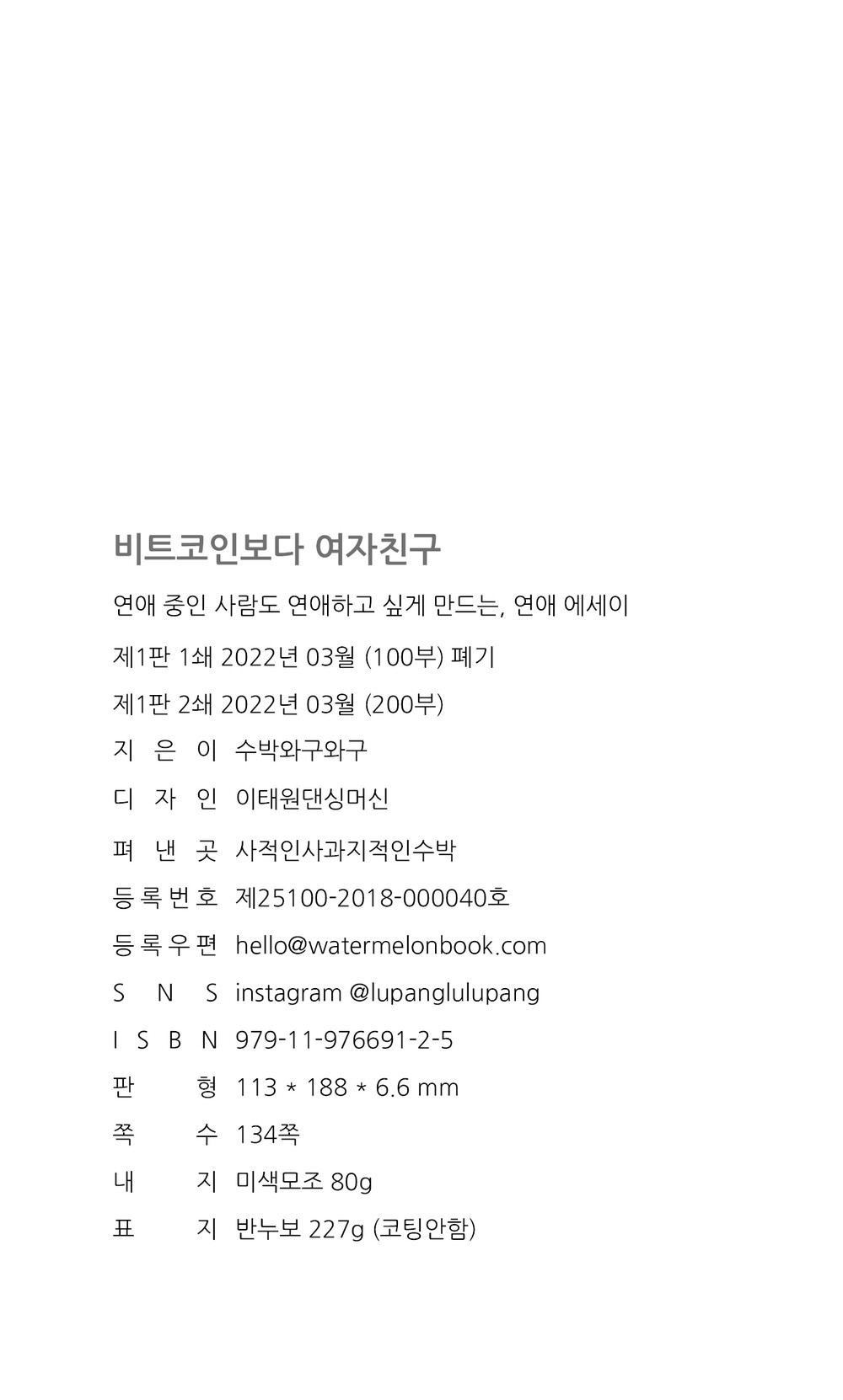 이번 책은 연애 에세이입니다. 이전 책이 그랬듯이, 연애는 소재일 뿐, 예상치 못한 방향으로 흘러갑니다. 맛집 에세이에 맛집 이야기는 안나오고 개똥철학만 늘어 놓았듯이, 이번에도 비트코인 이야기는 안 나옵니다. 여자친구를 핑계 삼아 하고 싶은 말만 토해냅니다. 지속 가능하도록 무코팅 종이포장을 추구합니다. 감사합니다!!