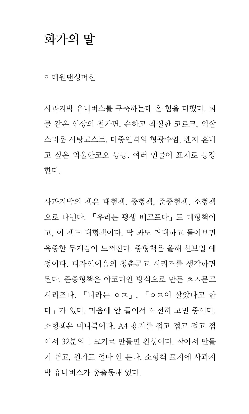 작가의 미루는 성정 때문에 고생했다. 왜 모든 작가는 게으른가. 예술이 원래 그렇다고 주장하니 마땅히 대처할 방법이 없었다. 출판사 사적인사과지적인수박의 문은 활짝 열려있다. 빠릿빠릿한 작가의 글을 기다린다.