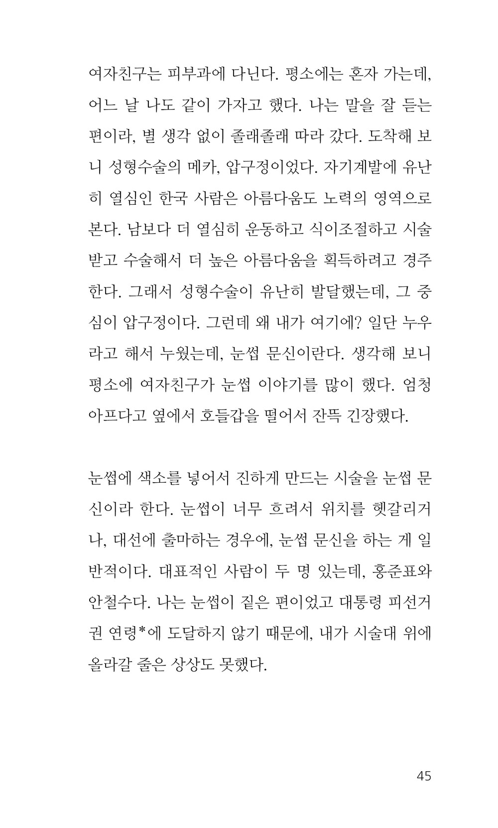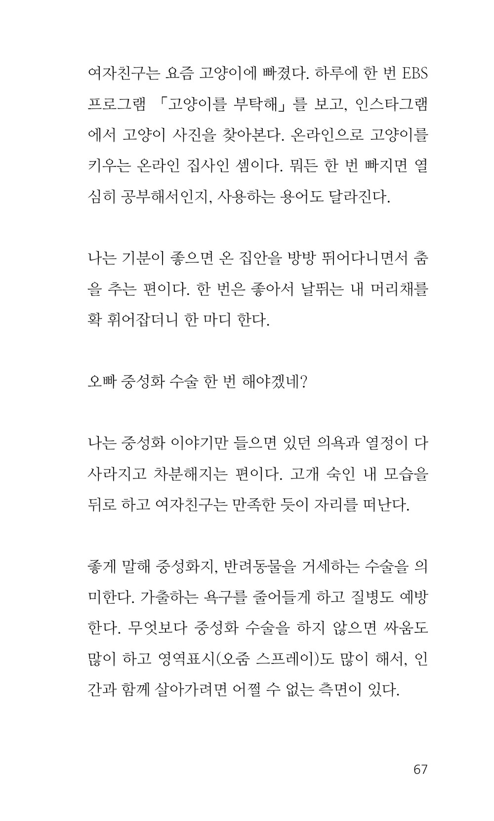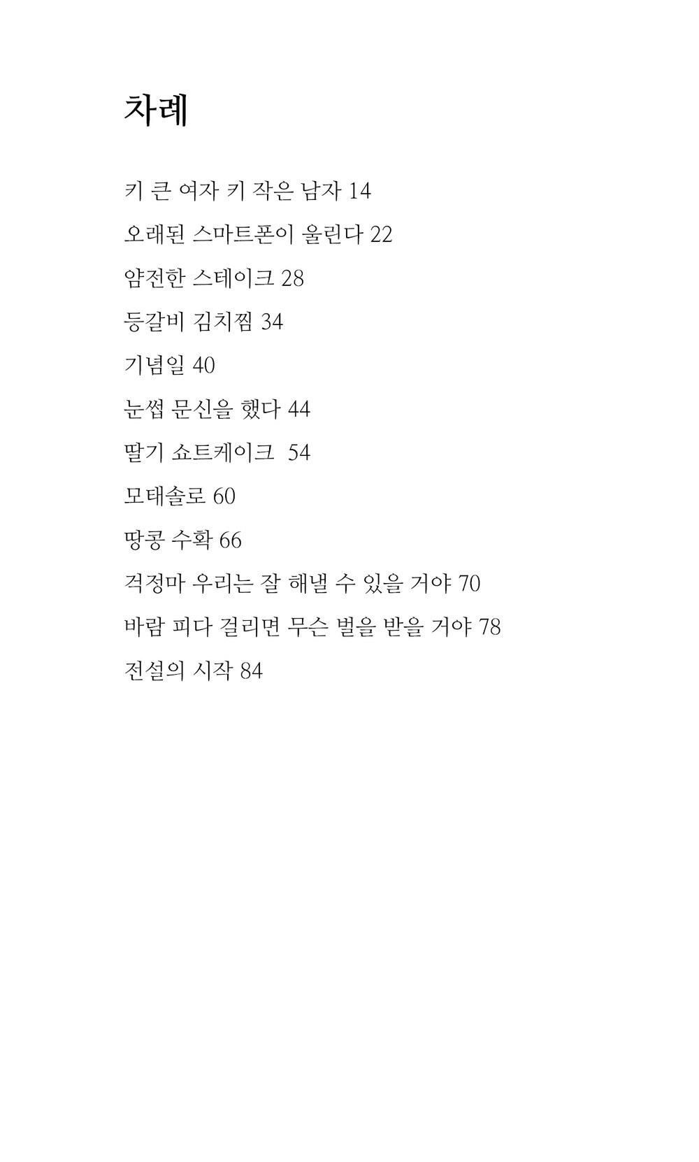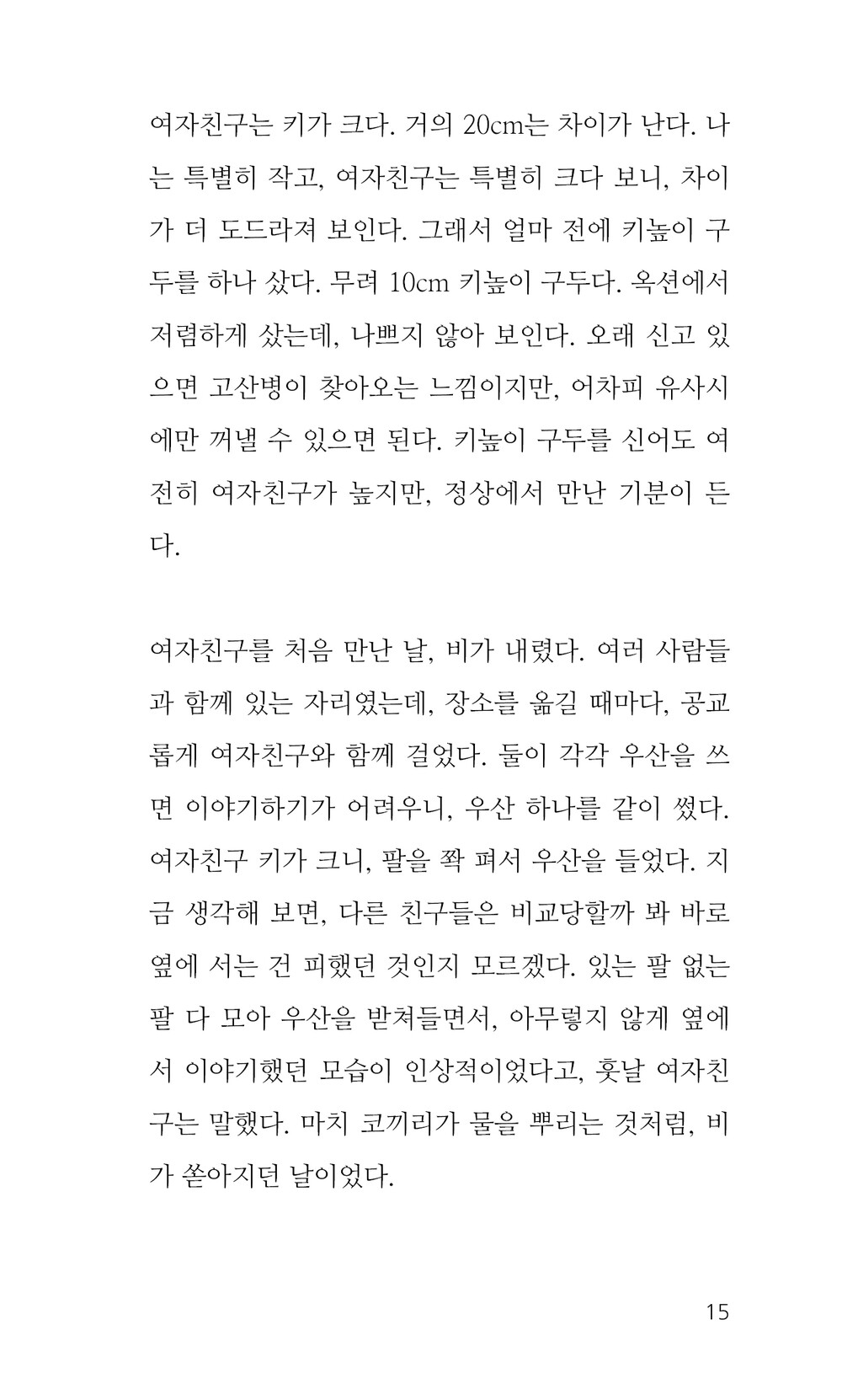내가 죽으면 다른 여자 꼬실거야? 태연하게 물어보는 여자친구를 안아주었다. 누구에게나 찾아오는 재난과 질병의 평등함 앞에서 우리만 예외일 수 없다. 다만 열심히 운동하고 더 열심히 쉬면서, 무탈을 기원하는 수밖에. 그래도 고통의 순간이 찾아온다면 함께 버텨낼 것이다. 항상 그랬던 것처럼. 걱정 마. 우리는 잘 해낼 수 있을 거야. 76