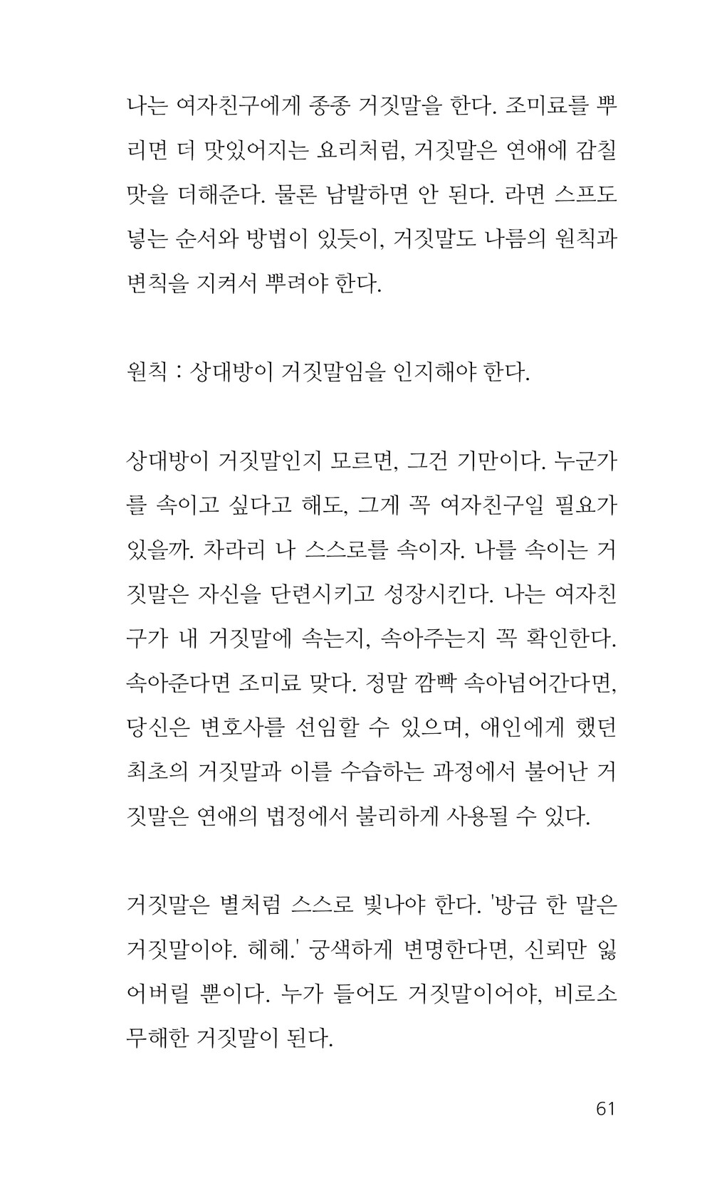 나는 여자친구에게 종종 거짓말을 한다. 조미료를 뿌리면 더 맛있어 지는 요리처럼, 거짓말은 연애에 감칠맛을 더해준다. 물론 남발하면 안된다. 라면 스프도 넣는 순서와 방법이 있듯이, 거짓말도 나름의 원칙과 변칙을 지켜서 뿌려야한다. 61