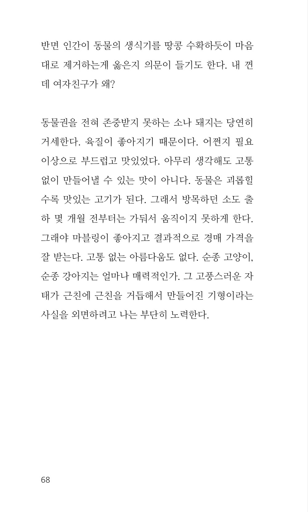 실제로 나는 여자친구와 세 번의 데이트를 하면서 다음 데이트를 제안하지 않았다. 당연히 사귀자는 말도 꺼내지 않았다. 참을성이 없고 성격이 불같은 여자친구는 길길이 날뛰면서 왜 집으로 초대하지 않느냐고 왜 고백하지 않느냐고 난동을 피웠다. 간신히 진압한 후에 집으로 초대했고, 오래 숙성해놓은 소고기를꺼냈다. 32