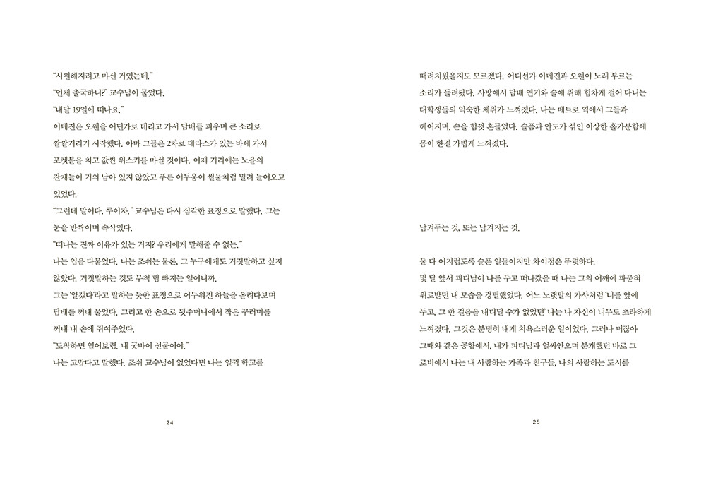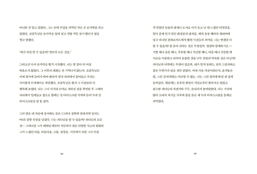 "가끔, 피디님이 출근한 후 혼자 남겨질 때면, 집에 있는 창문이란 창문은 모두 열고 도시의 여러 냄새들이 나뭇잎처럼 집안에 흘러들어오게 하곤 했다. 나는 의자에 앉아 최대한 무릎을 끌어올려 냄새들을 세고, 만져보고, 이름을 붙이길 좋아했다." (60쪽)