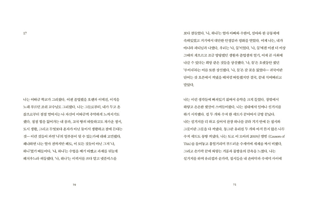 또한 <오하나>는 저자의 지극히 개인적인 동시에 고백적인 글이기도 합니다. 이 글은 한때 누군가의 아이였고 지금은 한 아이의 엄마가 된 저자의 사랑 고백입니다. <오하나>는 저자가 두고 떠나야 했던 그들, 즉 '남겨진 가족들'에게 바치는 편지입니다. 그런 의미에서 이 글은 저자의 가족에 대한 찬가로, 함께 보냈던 세월에 대한 감사의 끄덕임입니다.