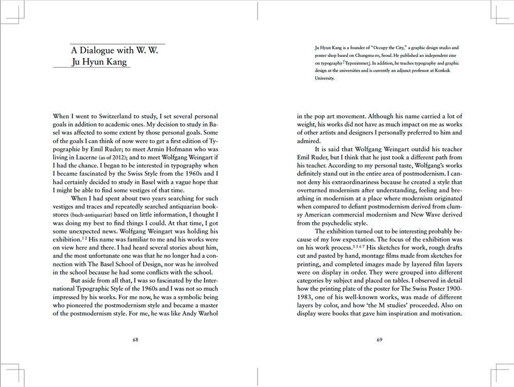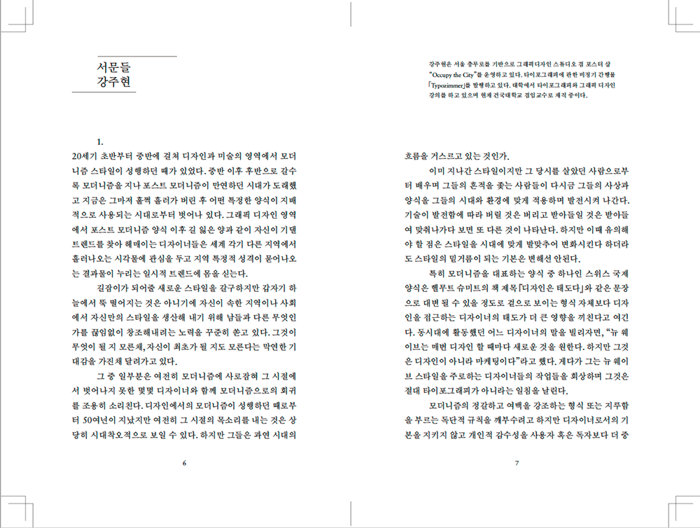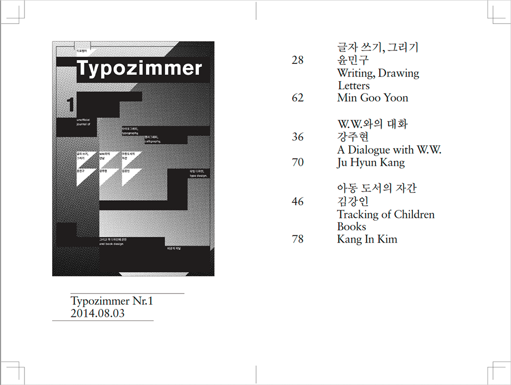 2014년 발행을 시작한 타이포그래피와 그래픽 디자인에 관한 비정기 간행물 <Typozimmer> 1호 부터 6호 까지의 글을 모아 엮고 영문으로 번역한 단행본입니다.