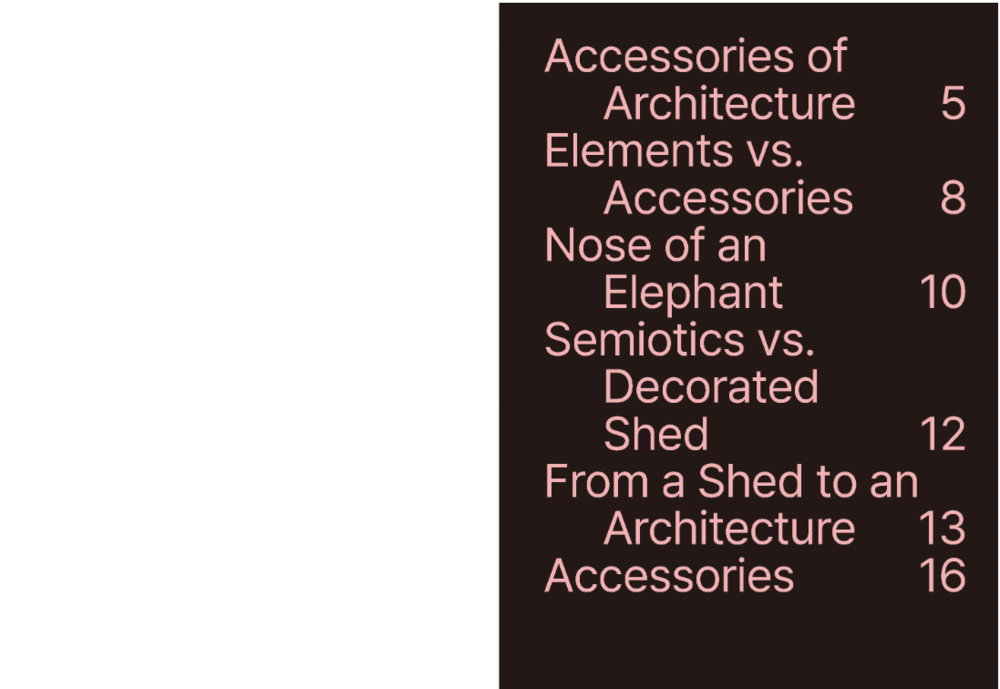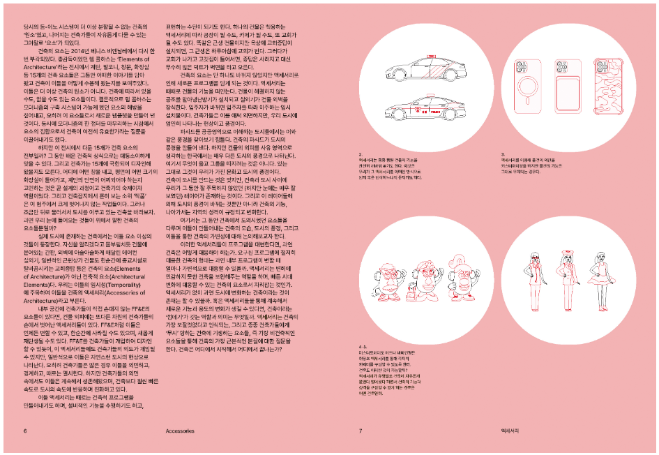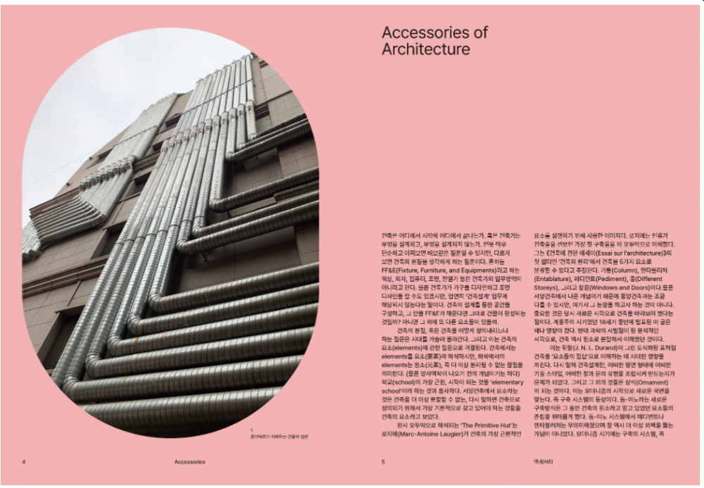 우리가 살고 있는 도시의 다양한 기능과 문화, 그리고 풍경을 담고 있는 요소에 주목한다. 이들은 분명 건축적인 요소와는 별개로 작동하는 구축 환경의 한 현상이다. 마치 건물에 덧입힌 것과 같은 액세서리가 어떻게 건축의 기능을 보완하고 도시의 풍경을 지배하는지 살펴본다.