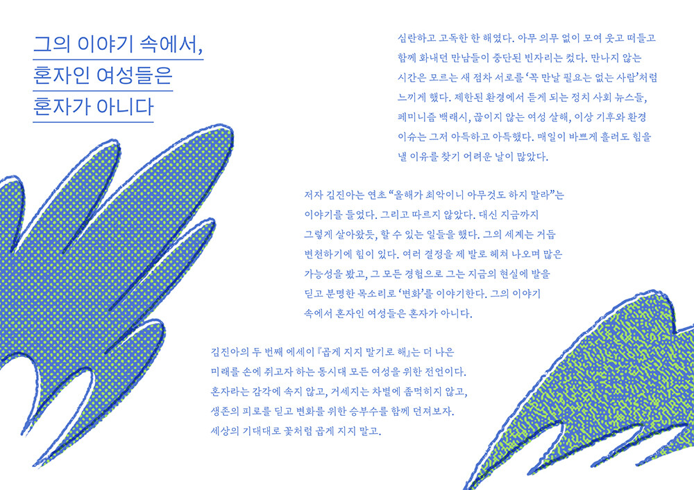 저자 김진아는 연초 “올해가 최악이니 아무것도 하지 말라”는 이야기를 들었다. 그리고 따르지 않았다. 대신 지금까지 그렇게 살아왔듯, 할 수 있는 일들을 했다. 그의 세계는 거듭 변천하기에 힘이 있다. 여러 결정을 제 발로 헤쳐 나오며 많은 가능성을 봤고, 그 모든 경험으로 그는 지금의 현실에 발을 딛고 분명한 목소리로 ‘변화’를 이야기한다. 그의 이야기 속에서 혼자인 여성들은 혼자가 아니다.