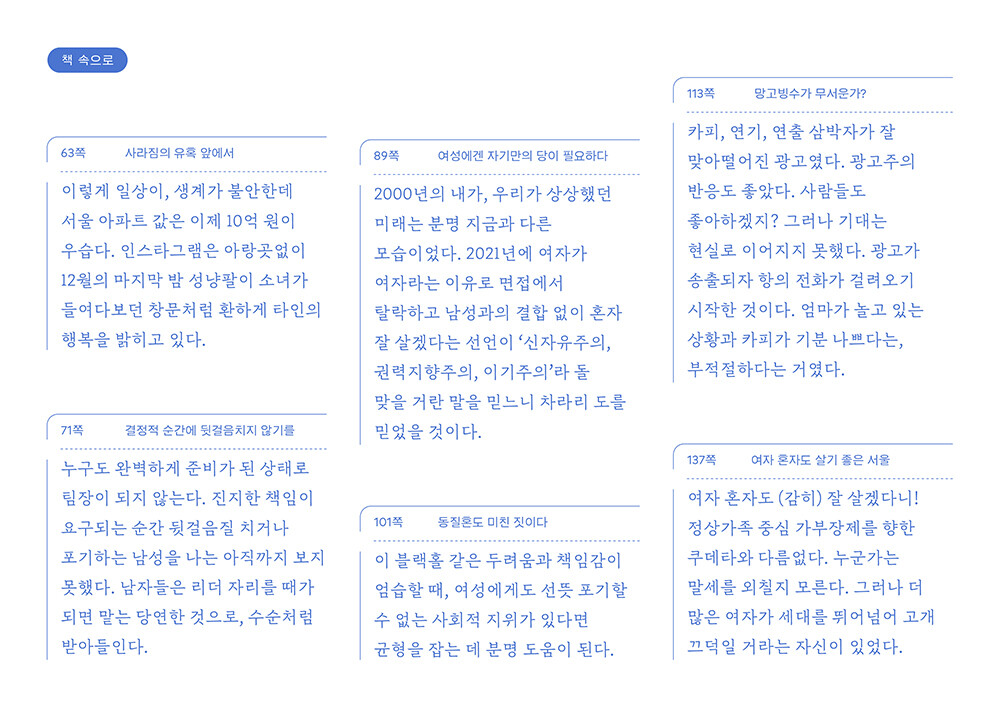 여자 혼자도 (감히) 잘 살겠다니! 정상가족 중심 가부장제를 향한 쿠데타와 다름없다. 누군가는 말세를 외칠지 모른다. 그러나 더 많은 여자가 세대를 뛰어넘어 고개 끄덕일 거라는 자신이 있었다.