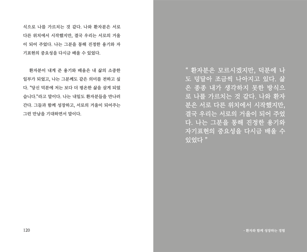 책 속에는 제가 환자들과 마주하면서 겪은 다양한 에피소드와 그로 인해 배우게 된 교훈들이 가득 담겨 있습니다. 때로는 저의 어리버리함이 오히려 환자들과의 거리를 좁혀주고, 그들의 마음을 열게 하는 도구가 되기도 합니다. 이런 경험을 통해 저는 삶의 복잡함을 조금씩 덜어내고, 환자들과 함께 성장하는 법을 배워갑니다.