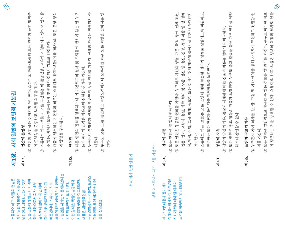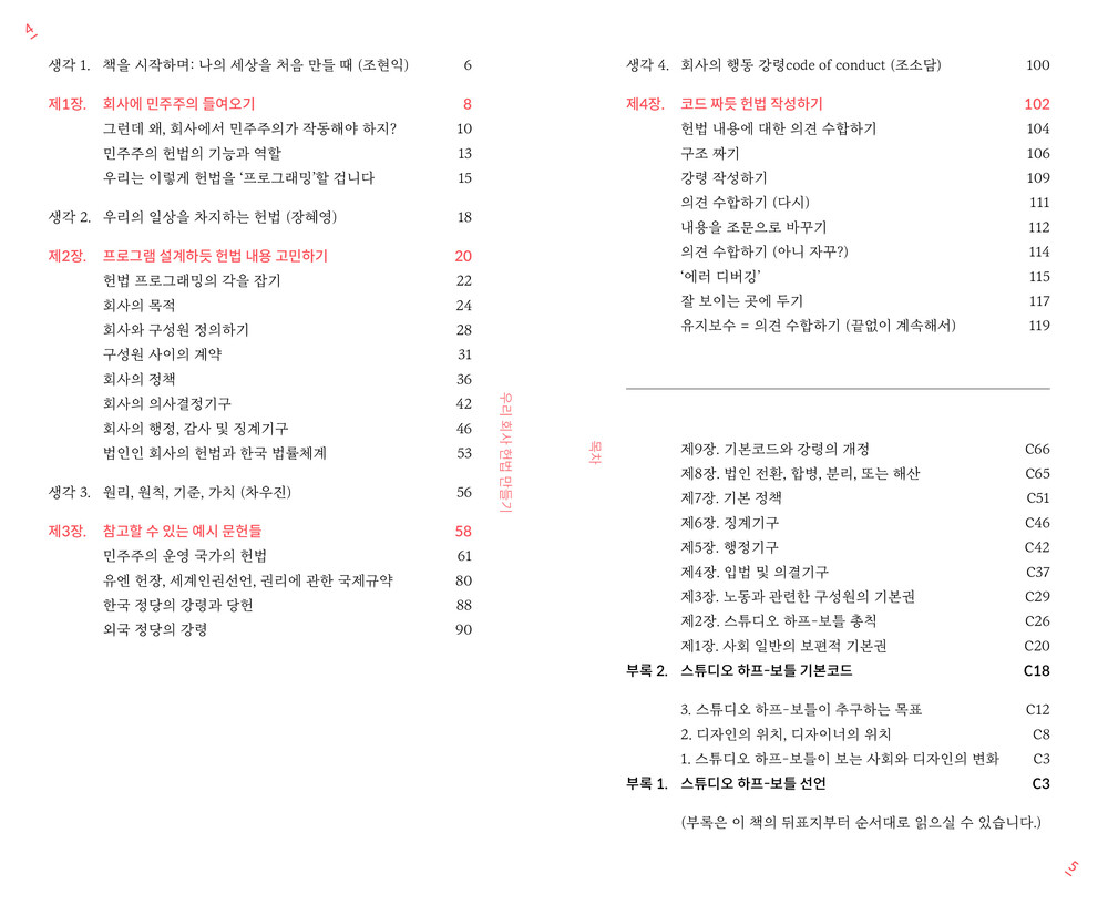 그래서 그는 회사의 ‘헌법’을 제안했습니다. 2019년에 ‘제정’된 이 헌법은 두 부분으로 나누어집니다. “스튜디오 하프-보틀 선언”은 디자인 업계에서 자아실현과 영리 충족이 모두 어려워지는 위기를 진단하고 이를 극복하기 위한 회사의 목표를 설정하는 강령입니다. “스튜디오 하프-보틀 기본코드”는 강령의 목표를 실현하기 위해 사내 인권, 입법·사법·행정 권력, 기본 정책에 대한 구체적인 규정을 여러 조항으로 엮은 것입니다.