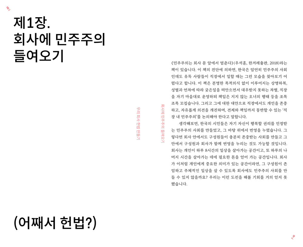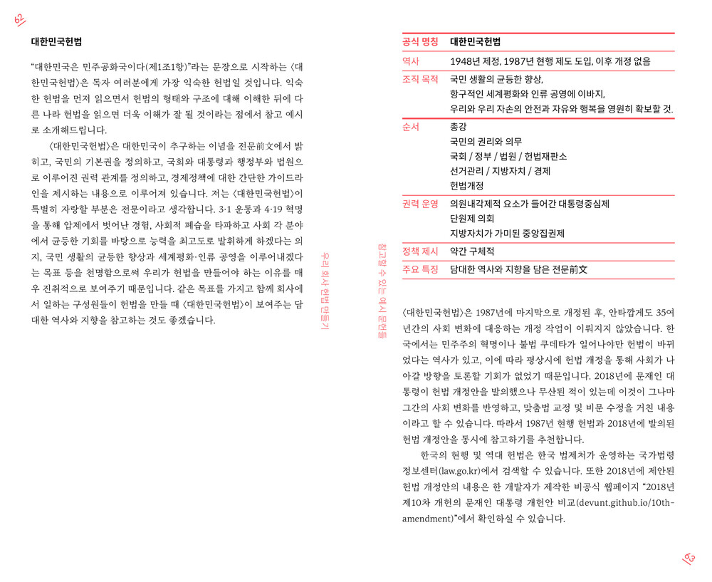 〈우리 회사 헌법 만들기〉는 글쓰기와 만들기에 익숙하지 않은 분들을 상상하며 쓰여진 책입니다. 헌법을 만드는 모든 과정을 A부터 Z까지 하나 하나 설명하지는 않습니다. 대신 그 과정에서 언제나 옆에 끼고 볼 수 있는 참고서 역할을 합니다. 헌법에 꼭 들어갈 내용에 대한 핵심 질문을 던지고, 참고가 될 만한 헌법(격 문서)을 가진 국가와 단체를 소개하고, 헌법을 만드는 과정에서 꼭 챙길 실무사항을 꼼꼼하게 짚습니다.