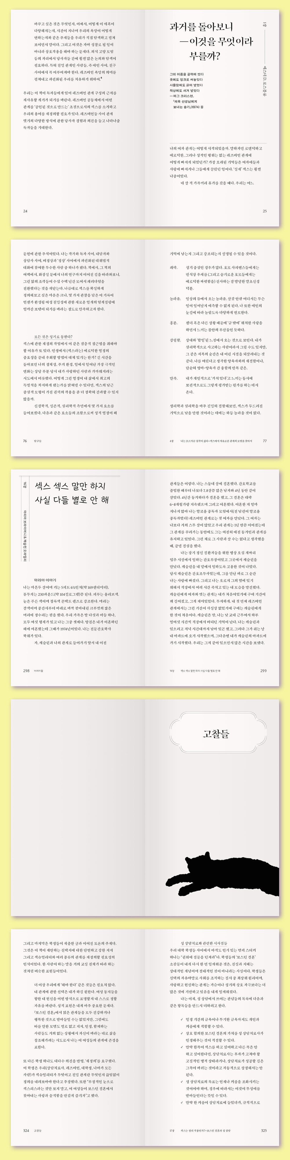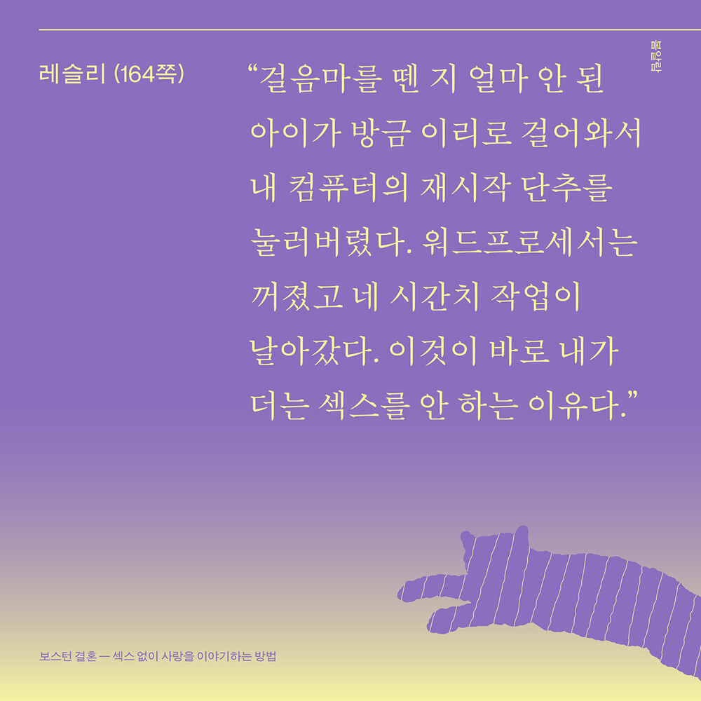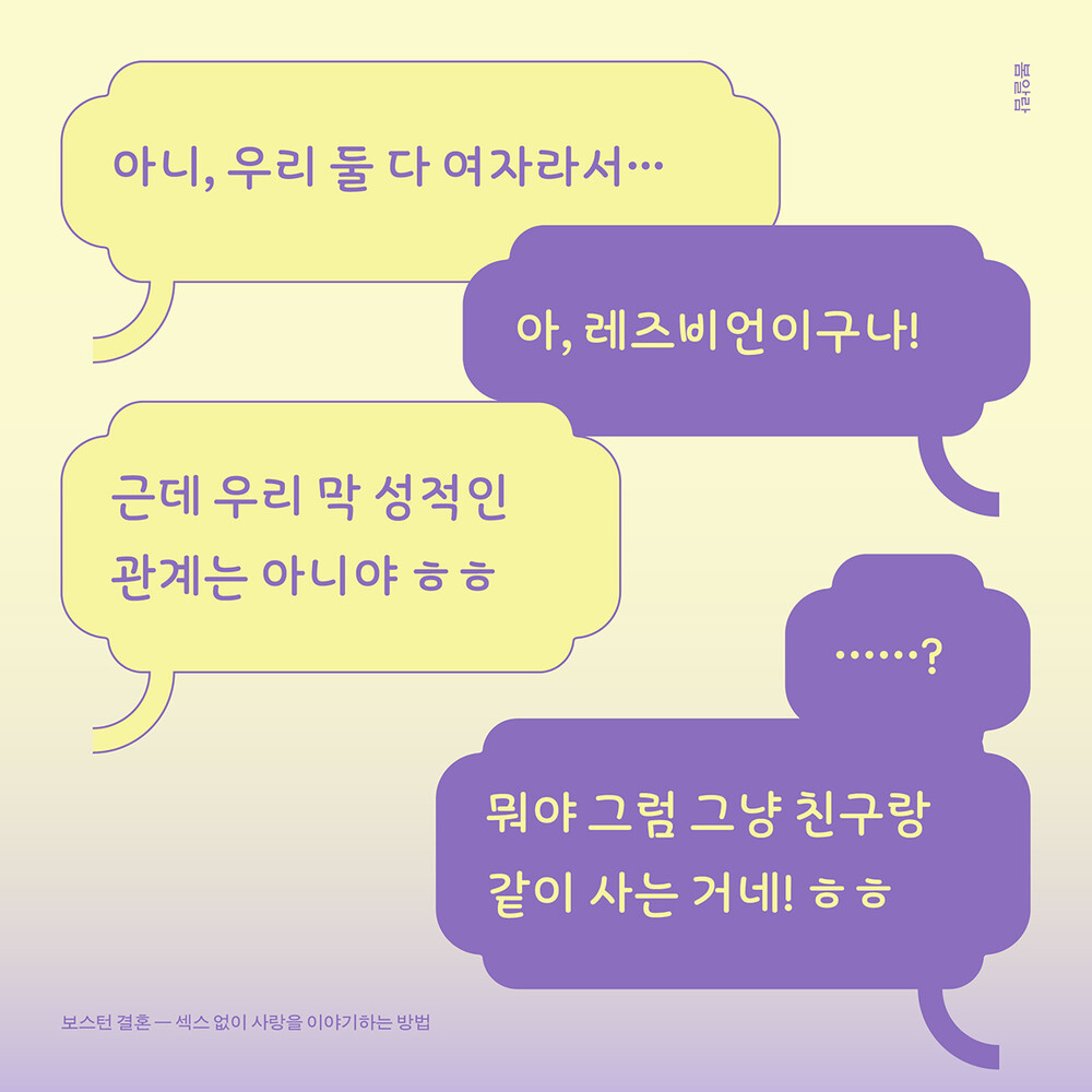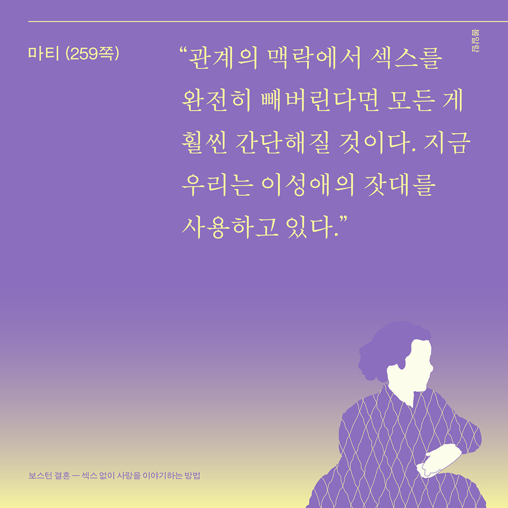 “『보스턴 결혼』이 말하는 사랑은 오롯이 두 사람에 입각한 관계다. 이성애라는 규범의 바깥에서 우리는 이 자연발생적인 사랑을 어떻게 수용할 수 있을까? 이미 그렇게 살고 있는 사람들 곁으로 가면 된다. 이 책에 등장한 이들을 만나보는 동안 나는 잠시 정직해졌다. 그리고 인정했다. 탯줄로 이어진 듯한 관계에서는 섹스로 불안을 몰아낼 필요가 없다는 것을.”