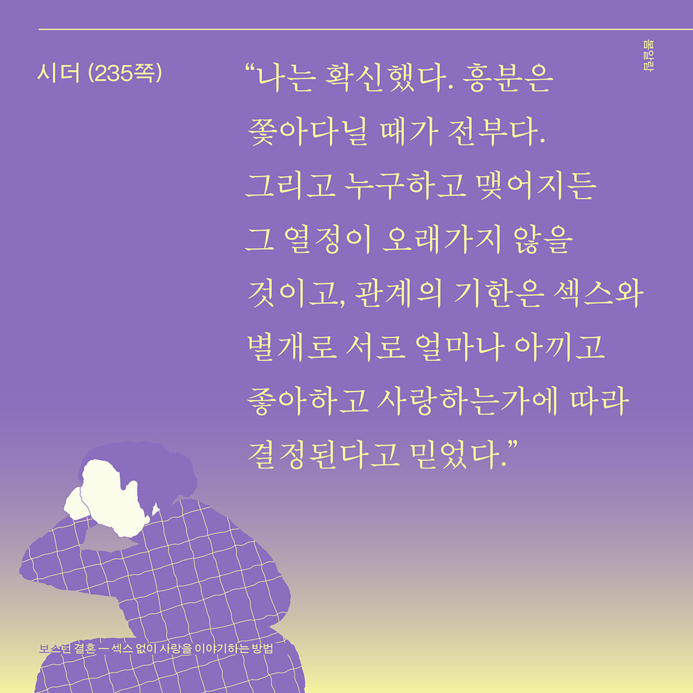 “우리 시대는 특정한 성적 반려 간 헌신서약만을 인정한다. 이 책이 선사하는 한 가지 선물은, 성적관계 바깥의 헌신에 대한 암묵적 승인이다. 만약 세상이 허용하고 이름 붙인 것이 아닌 우리가 경험하는 현실을 바탕으로 관계를 정의한다면, 우리는 어떤 종류의 친밀성을 설명하려 하고, 어느것에 가치를 둘까? 어떤 종류의 헌신 약속을 하고, 어느 것을 존중할까? 당신의 인간관계에서 정말로 무엇을 경험했는지 잠시 떠올려보라. 그리고 각 관계의 이름보다는 실상이 말하게끔 하라.”