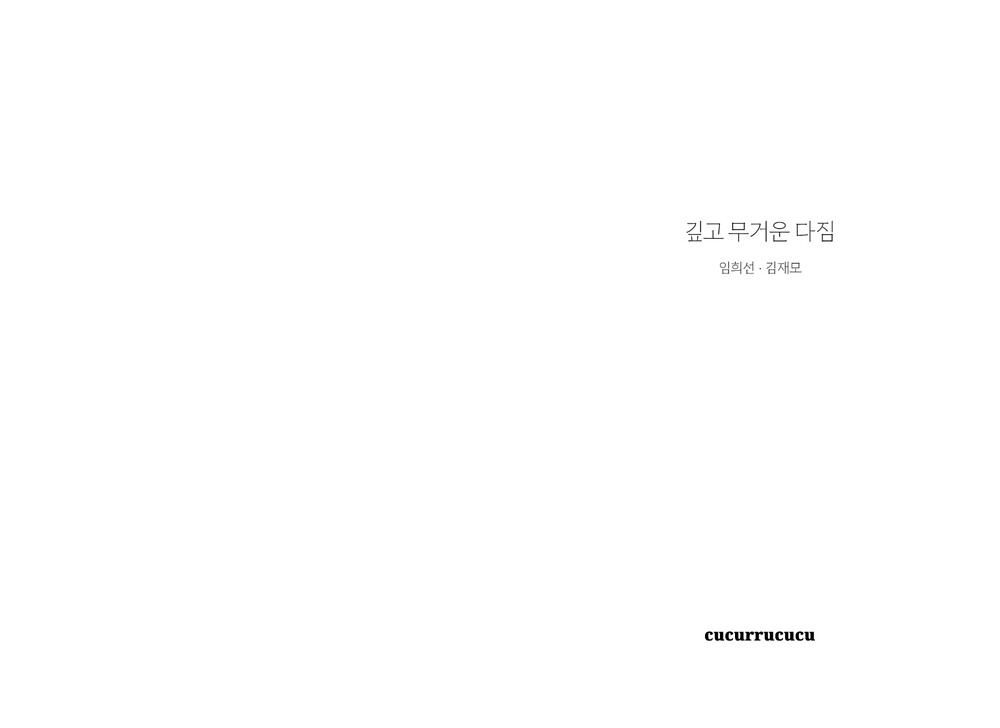 <깊고 무거운 다짐>은 희선과 재모가 결혼을 기념하며 만든 책이다. 우리는 평소에 순간과 영원을 자주 이야기했다. 함께하는 매 순간을 잊지 못할 영원으로 만들자고. 눈이 녹으면, 꽃이 지면, 새가 날개를 움직이면 사라지는 순간이지만, 변해버릴 미래를 두려워하거나 이미 지나간 과거를 후회하지 말자고 말이다. 순간을 영원으로 남기고 싶은 마음에는 사랑이 있다. 그리고 지금 여기에만 온 힘을 쏟아붓자는 약속이 있다. 그 약속을 고민하며 가까운 주변 사람들에게 ‘사랑’이라는 단어가 들어간 질문을 받고, 각자가 질문에 대한 답을 써 내려갔다.