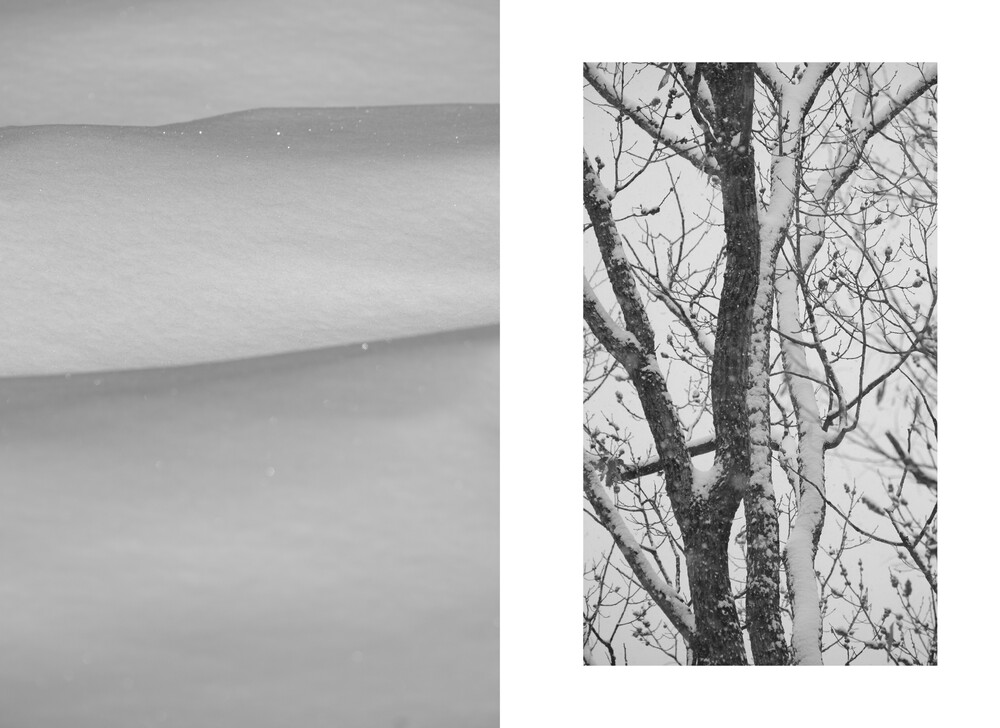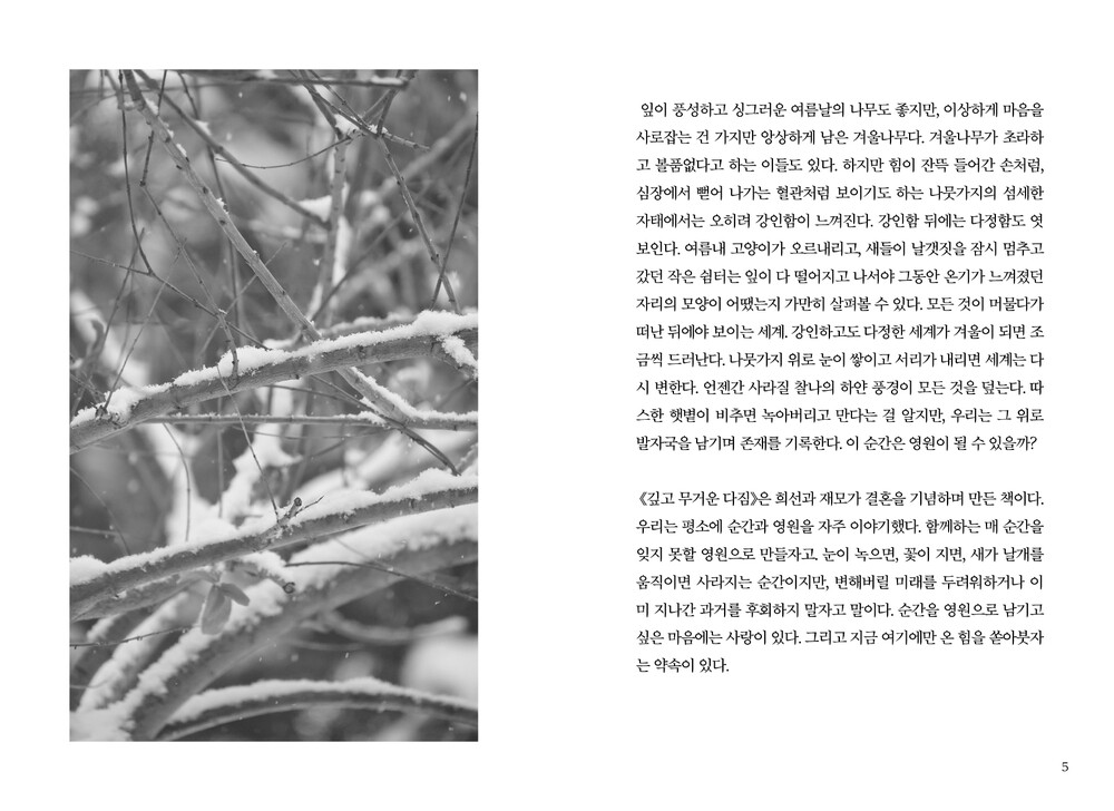 잎이 풍성하고 싱그러운 여름 나무도 좋지만, 이상하게 마음을 사로잡는 건 가지만 앙상하게 남은 겨울나무다. 겨울나무가 초라하고 볼품없다고 하는 이들도 있다. 하지만 힘이 잔뜩 들어간 손처럼, 심장에서 뻗어 나가는 혈관처럼 보이기도 하는 나뭇가지의 섬세한 자태에서는 오히려 강인함이 느껴진다. 강인함 뒤에는 다정함도 엿보인다. 여름내 고양이가 오르내리고, 새들이 날갯짓을 잠시 멈추고 갔던 작은 쉼터는 잎이 다 떨어지고 나서야 그동안 온기가 느껴졌던 자리의 모양이 어땠는지 가만히 살펴볼 수 있다. 모든 것이 머물다가 떠난 뒤에야 보이는 세계. 강인하고도 다정한 세계가 겨울이 되면 조금씩 드러난다. 나뭇가지 위로 눈이 쌓이고 서리가 내리면 세계는 다시 변한다. 언젠간 사라질 찰나의 하얀 풍경이 모든 것을 덮는다. 따스한 햇볕이 비추면 녹아버리고 만다는 걸 알지만, 우리는 그 위로 발자국을 남기며 존재를 기록한다. 이렇게 하면 순간은 영원이 될 수 있을까?