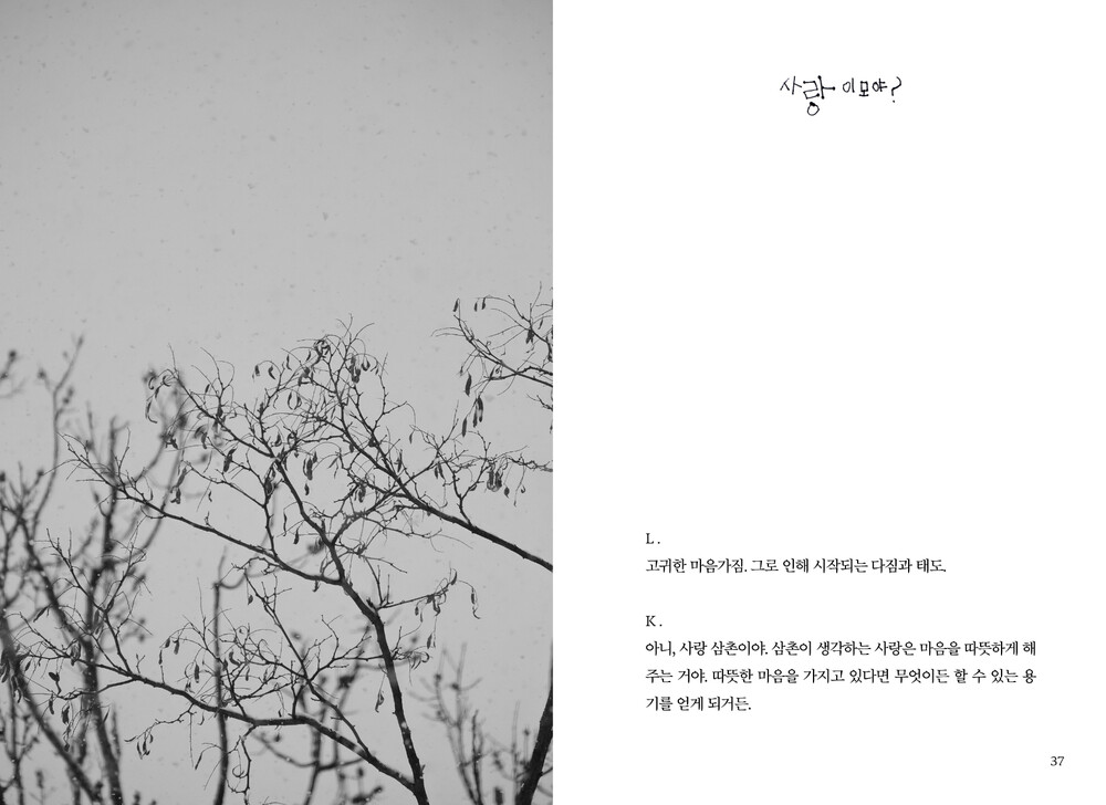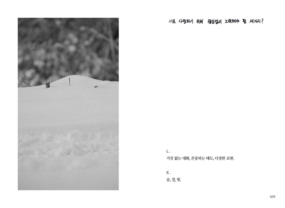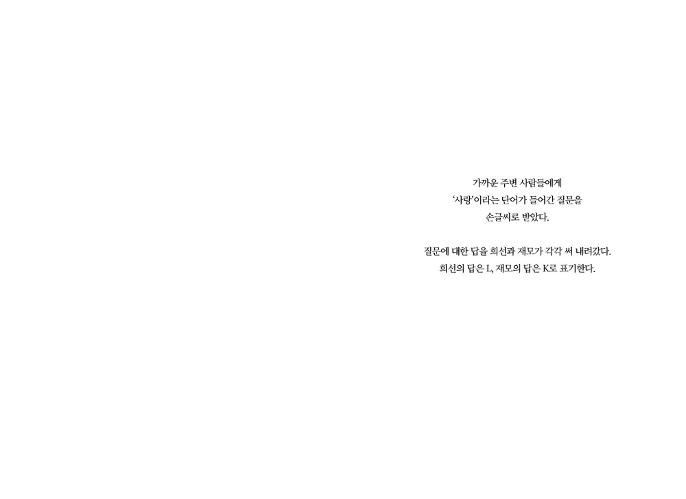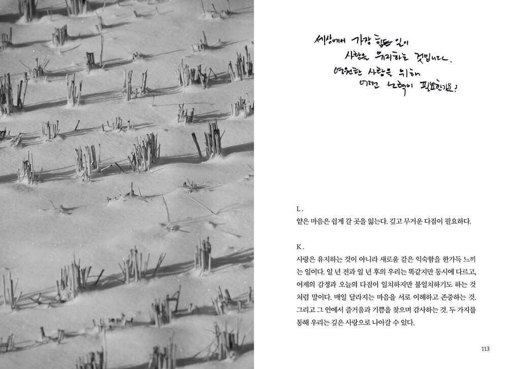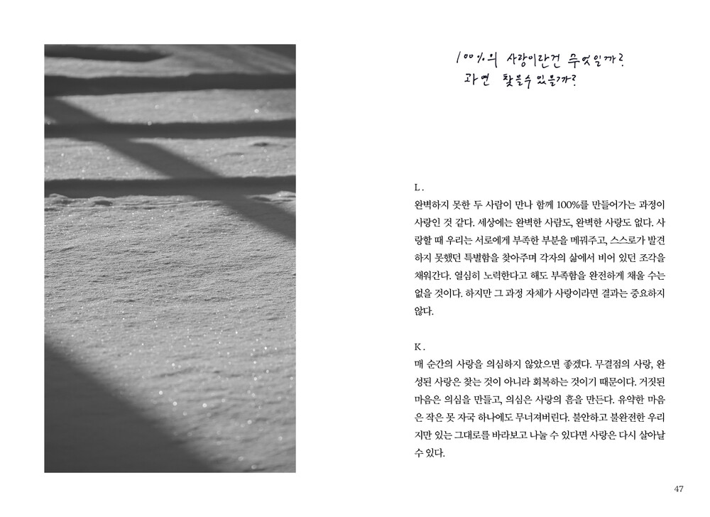 만일 혼자 사랑할 수 있다면 우리는 사랑을 말하지 않을지도 모른다. 순간으로 사랑의 전부를 알 수 있다면 우리는 사랑을 말하지 않을지도 모른다. 마른 종이 위에 얇은 펜 자국이 눌리고, 빈칸을 차분히 채워 한 통의 편지가 되는 것처럼 사랑은 그렇게 서로의 순간을 쌓아 완성하는 것일지도.