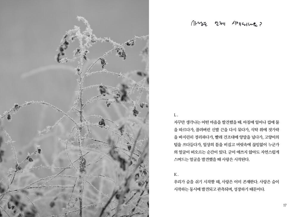 아침에 일어나 컵에 물을 따르다가, 풀려버린 신발 끈을 다시 묶다가, 식탁 위에 젓가락을 바지런히 정리하다가, 빨래 건조대에 양말을 널다가, 고양이의 털을 쓰다듬다가, 일상의 틈을 비집고 머릿속에 끊임없이 누군가의 얼굴이 떠오르는 순간이 있다. 굳이 애쓰지 않아도 자연스럽게 스며드는 얼굴을 발견했을 때 사랑은 시작된다.
