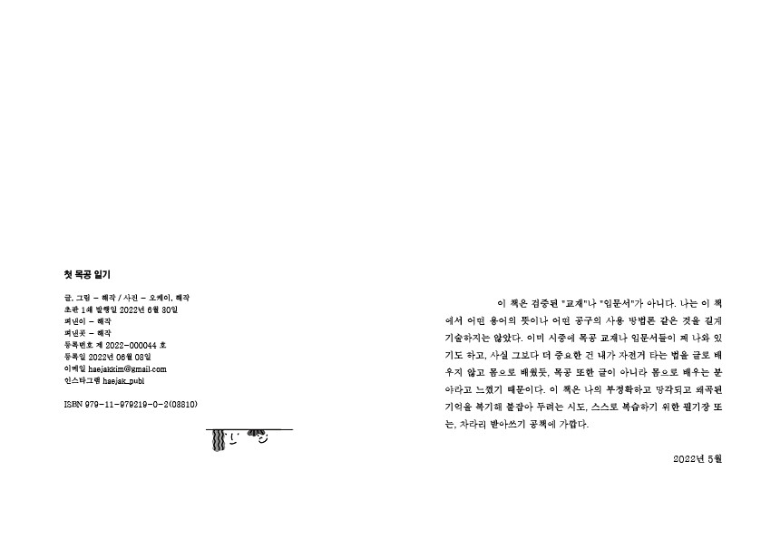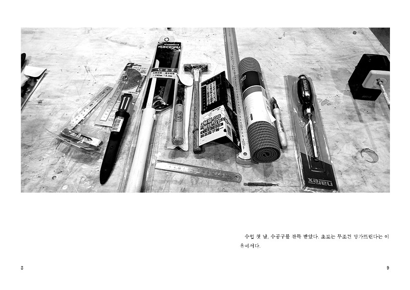 이 책은 검증된 "교재"나 "입문서"가 아니다. 나는 이 책에서 어떤 용어의 뜻이나 어떤 공구의 사용 방법론 같은 것을 길게 기술하지는 않았다. 이미 시중에 목공 교재나 입문서들이 꽤 나와 있기도 하고, 사실 그보다 더 중요한 건 내가 자전거 타는 법을 글로 배우지 않고 몸으로 배웠듯, 목공 또한 글이 아니라 몸으로 배우는 분야라고 느꼈기 때문이다. 이 책은 나의 부정확하고 망각되고 왜곡된 기억을 복기해 붙잡아 두려는 시도, 스스로 복습하기 위한 필기장 또는, 차라리 받아쓰기 공책에 가깝다.