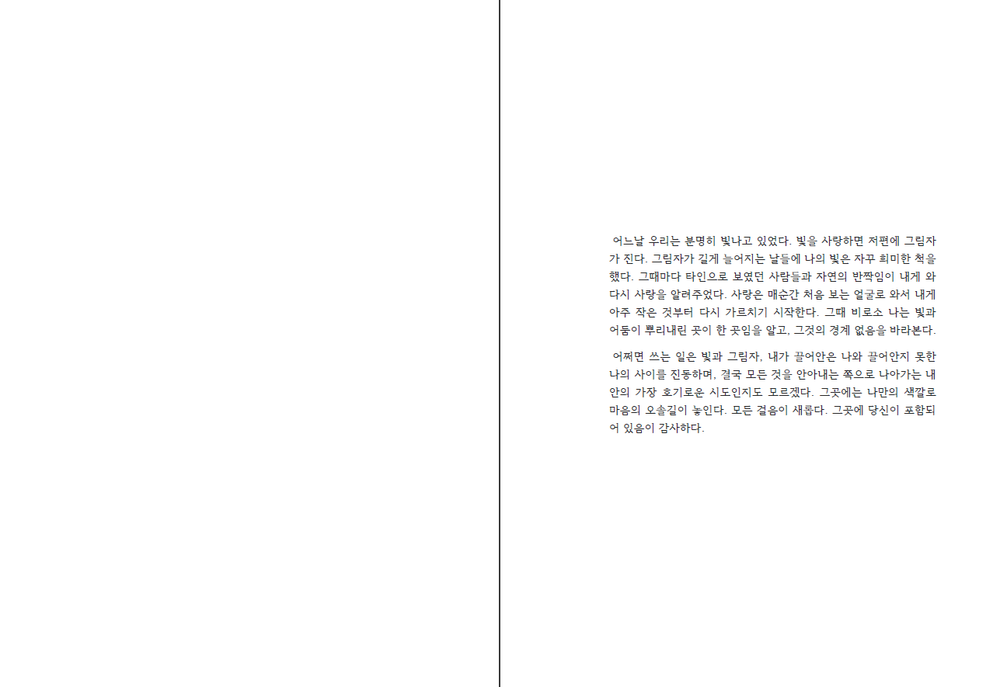 그러나 여럿 명백한 타인과 자연이 ‘우리’로 들어와 나를 사랑했다. 나를 지탱한 멋진 사랑을 주기 위해 나는 다시 빛을 품는다.