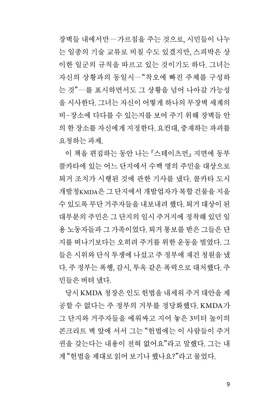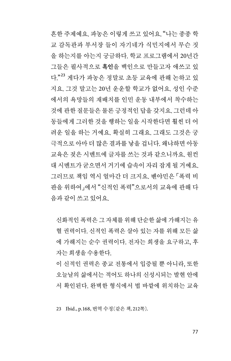 아무도 반응하지 않아 들릴 가능성이 아예 없을 때, 그리하여 폭력이 하나의 방도로 간주될 때,이 폭력을 자신에게 가해진 폭력에 대한 정당한 보상 수단이라고 생각하지 마세요. 113쪽