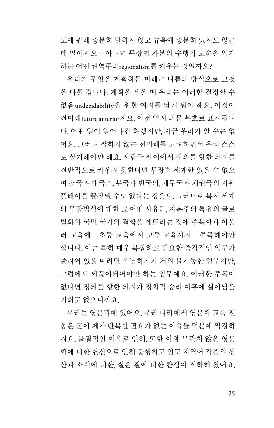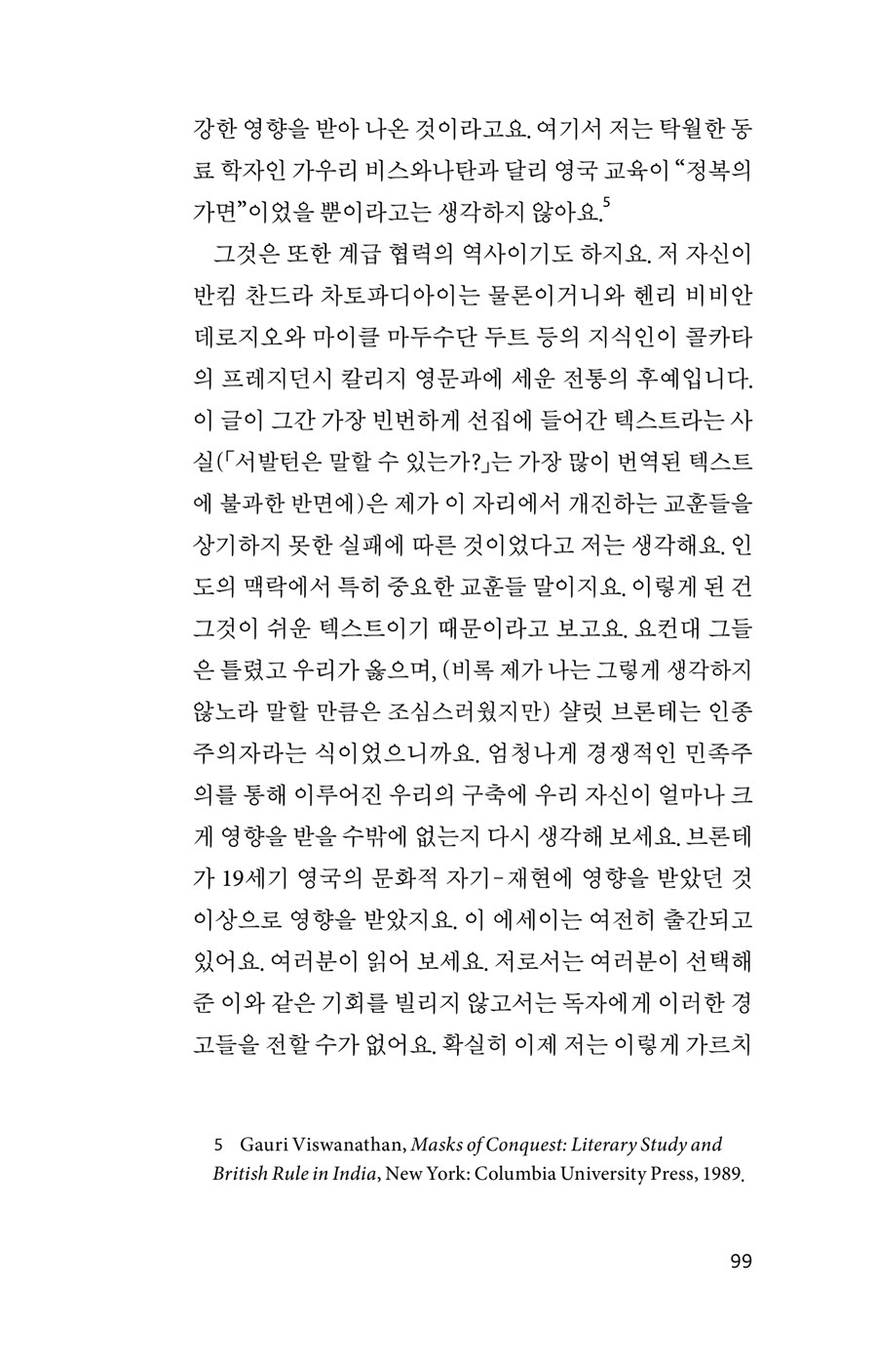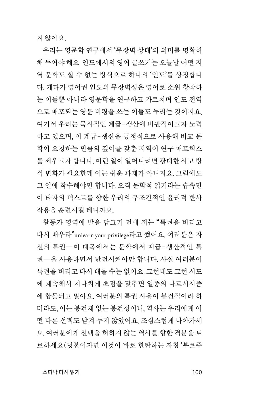 나아가 문학과 이론을 읽고 쓰는 일, 상상력 훈련에 대한 스피박의 강력한 옹호는 우리에게 견고한 지침이 되어 줄 거예요.