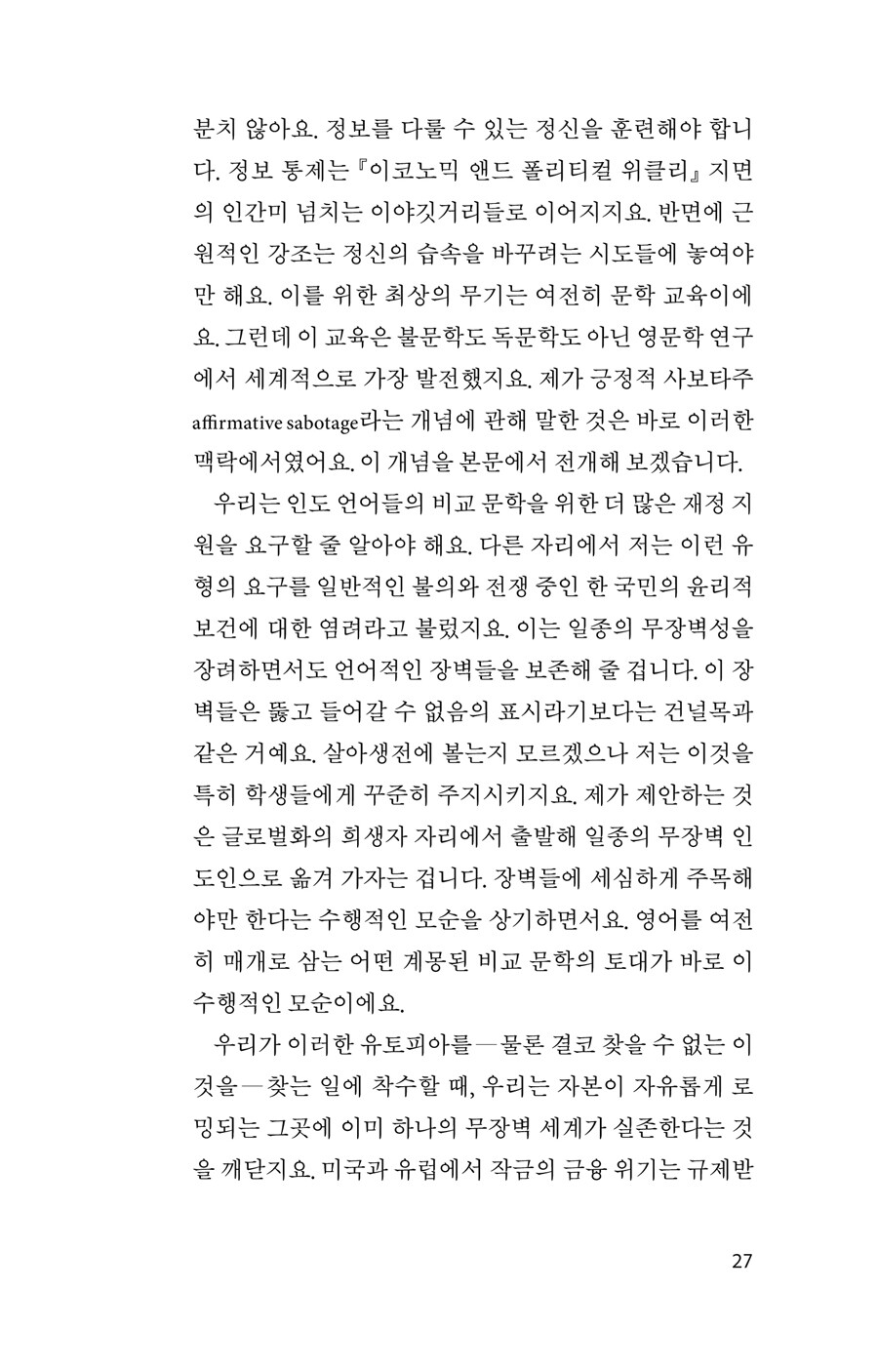 스피박은 인문학의 요체가 ‘욕망들의 비강제적 재배치’임을 우리에게 주지시켜 왔다. 우리의 욕망이 민족주의적이고 자본주의적이며 성 차별적인 승리들보다는 계급, 인종, 젠더 평등을 향하도록 이끌 수 있어야 한다는 것이다. 이런 재배치를 위한 교육을 그는 ‘상상력 훈련’이라 부른다. 이 훈련은 어떻게 이루어지는가? 학생과 독자가 텍스트의 세부에 주목해텍스트 안에 흔적으로 남은 타자의 목소리를 살피게 만듦으로써. 그가 자크 데리다의 텍스트들에서 배운 ‘탈구축’déconstruction이란 해체하고 파괴하는 무언가가 아니라 이 같은 면밀히 읽기의 다른 이름일 따름이다. 그러므로 읽기의 근원적인 목표는 지식 습득이 아니라정신의 습속 변화며, 비교 문학자인 스피박에게 이를 위한 최상의 무기는 여전히 문학 교육, 특히 영문학 연구 전통이다. 무언가가 독이 될 수도 약이 될 수도 있음을 언제나 유념하는 그는 학생들에게 정교하게 발전한 제도적 문학 연구를 폐기하기보다는 ‘긍정적 사보타주’를 통해 그것의 성과를 움켜쥐고 사용하라고 권한다.