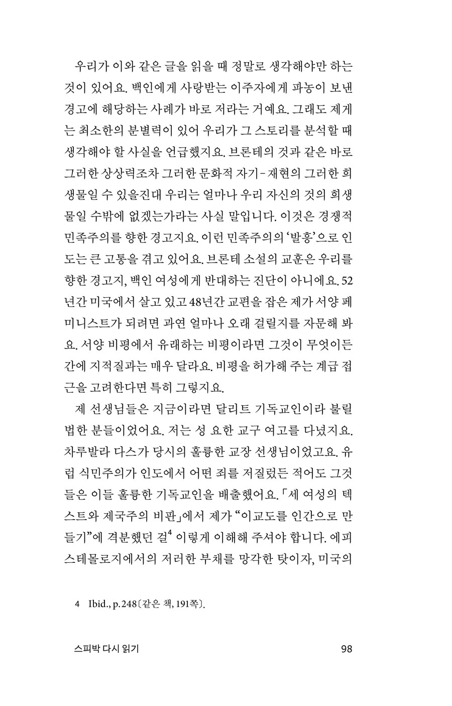 다음 장인 「스피박 다시 읽기」에서는 자신의 과거 텍스트인 「세 여성의 텍스트와 제국주의비판」과 「잘못을 바로잡기」를 검토하면서 이 글들이 나온 배경과 더불어 저자인 과거 자신의 ‘검토되지 않은 문화적 가정들’이 무엇이었는지를 해명한다. 그리하여 그는 「세 여성의텍스트와 제국주의 비판」이 “요컨대 그들은 틀렸고 우리가 옳으며, (비록제가나는그렇게생각하지않노라말할만큼은조심스러웠지만) 샬럿 브론테는 인종주의자라는 식”(99)으로 읽혀 온 것에, 그리고 자신이 그런 해석의 여지를 제공한 것에 유감을 표명하며, 「잘못을 바로잡기」와 관련해서는 “바깥의 부름이 있다는, 그러므로 인간 존재들은 타자의 부름을 통해인간이 된다는 관념이, 이제 제게는, 너무 감상적인 걸로 보”(129)인다고 말하면서 “권리와책임이 ‘도래하다’라는 영속적 양식으로 모두에게 공유될 수 있다고는 더 이상 믿지 않아요. 이제는 이것이 교육 철학을 통해 하나의 정신 집합으로서 에피스테몰로지적으로 창조되어야 한다고 믿지요”(130)라는 새로운 인식을 강조한다.