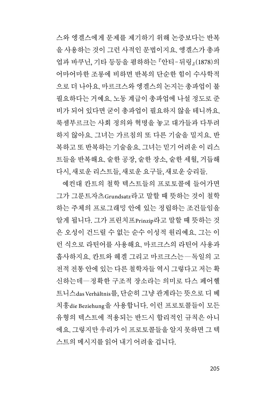이론가의 작업에서 언어적 실천은 대충 다루고 논증의 핵심만 간추려서는 안 됩니다. 이론을읽는 건 그것을 하나의 1차 텍스트로 읽는 거예요. 도구화해 적용하려는 어떤 것으로 이론을 읽는 게 아니에요. 그것 자체를 위해 읽는 것이지요. 그것은 우리의 정신적 비품의 일부가 됩니다.107쪽