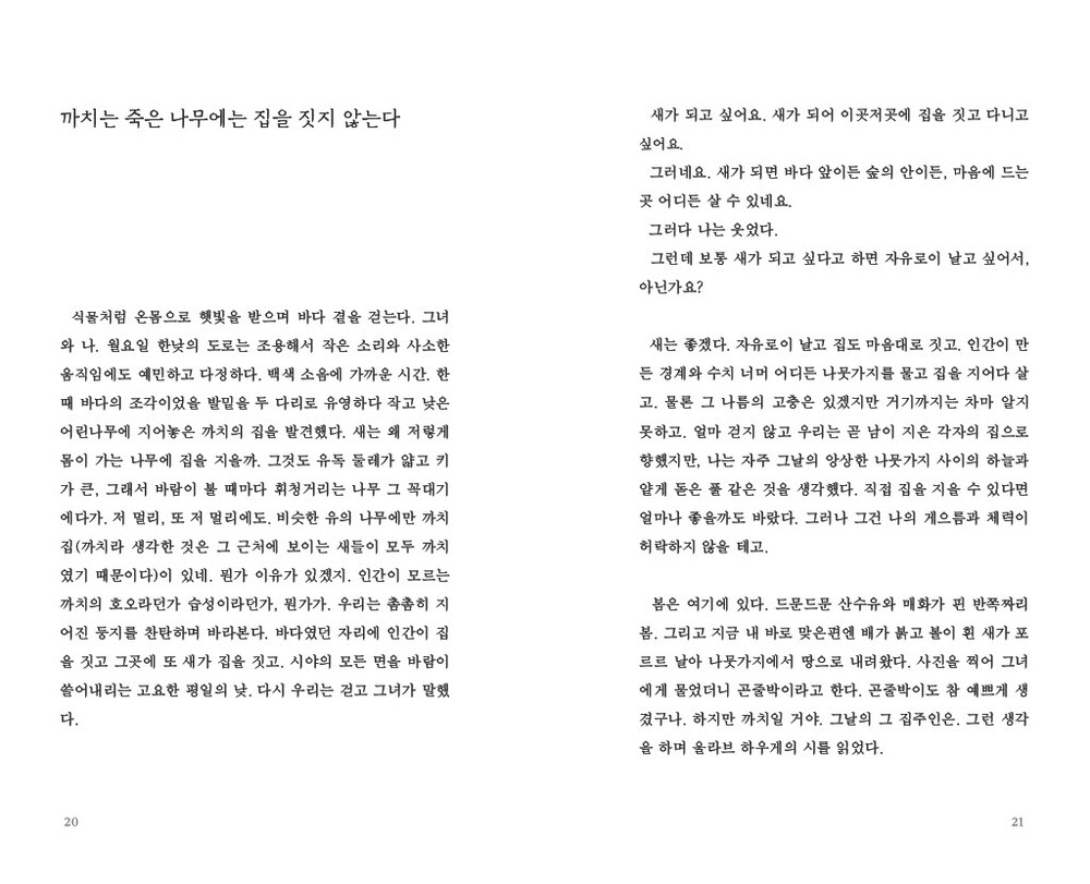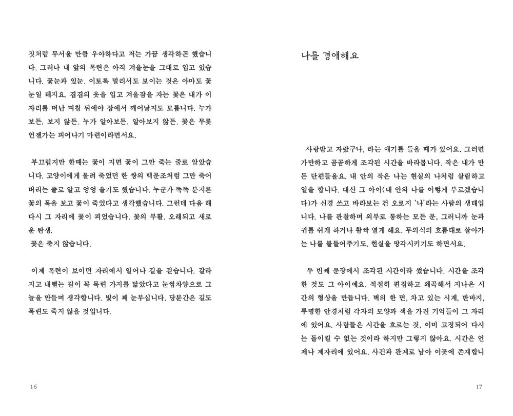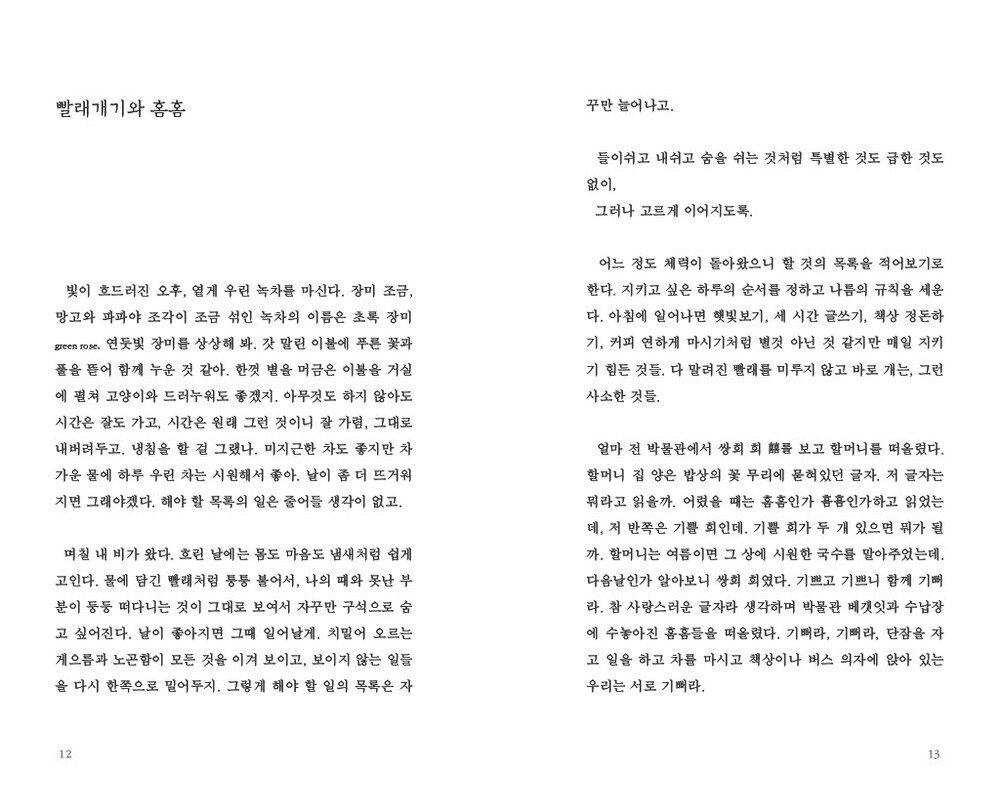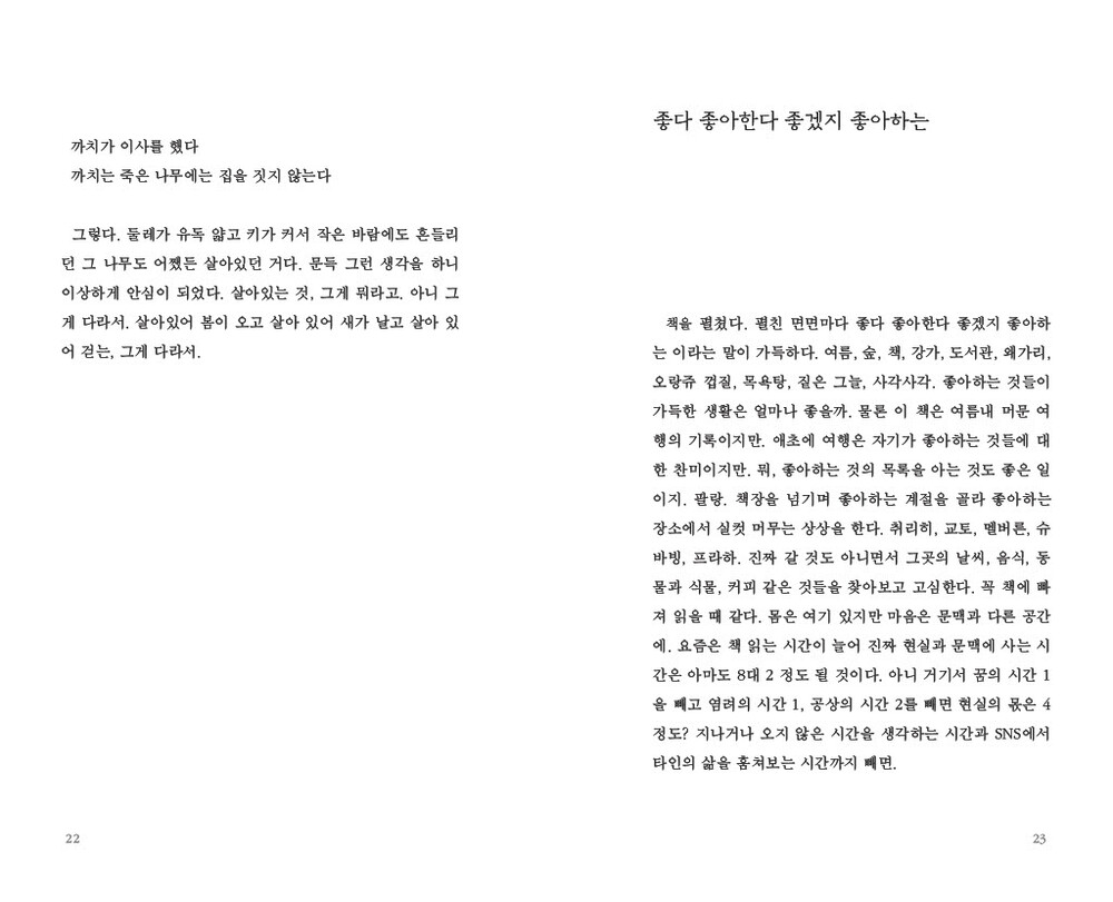 일상과 기억, 혹은 밀어드는 파도와 같은 자연과 사물들이 주된 이야깃거리이자 사색의 근원이 됩니다. 여러 군데에서 뒤섞인 시제로 지내는 언어와 감각들을 제가 쓸 수 있는 글로 풀어냈어요. 순간의 해석이자 관계, 대화에 대한 기록은 과거와 현재에 대한 제 고백들이기도 하지만 동시대를 사는 사람들이 공감할 만한 글이기도 할 것입니다. 서로의 마음을 알기 위한 노력을 하지 않고는 우리는 서로를 알 수 없습니다. 자신의 마음을 알기위한 노력을 하지 않고는 자신을 알 수 없기도 하지요. 저는 그 둘이 연결되어 있다고 믿습니다. 개인적인 이야기가 세상을 더 다정하고 풍요롭게 만든다고도 믿어요. 작은 돌멩이를 옮기는 마음으로 쓴 목록입니다.