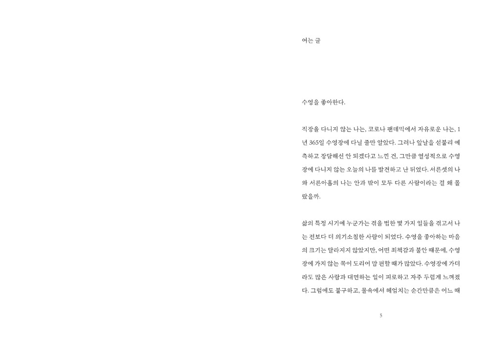 수영하는 동안 나는 물의 보호를 받는다. 젤리처럼 부드러운 물이 내 몸을 감싸고 나를 중력으로부터 해방한다. 나는 가벼워진 몸으로 물과 하나 되어 망설임 없이 흘러간다. 흘러가는 순간의 나는 현재의 고정된 내 모습에서 벗어난다. 나는 더 이상 현재의 나로 나를 판단하지 않는다. 나는 내 안에 잠재한 어떤 가능성으로만 나를 본다.