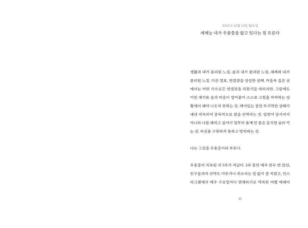 솔직하게 털어놓지도, 온전히 이해받지도 못할 종류의 우울을 글로 쓰고 책으로 엮음으로써