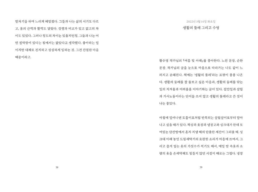 새로운 자세를 터득하는 일보다 지금 가진 실력으로 수영하는 시간을 꾸준히 늘려가는 일에 집중하고 싶은 마음. 남을 부러워해서 나를 그 모습으로 변화시키려고 애쓰기보다 지금의 나를 돌보고 아끼는 일에 전념하고 싶은 마음.