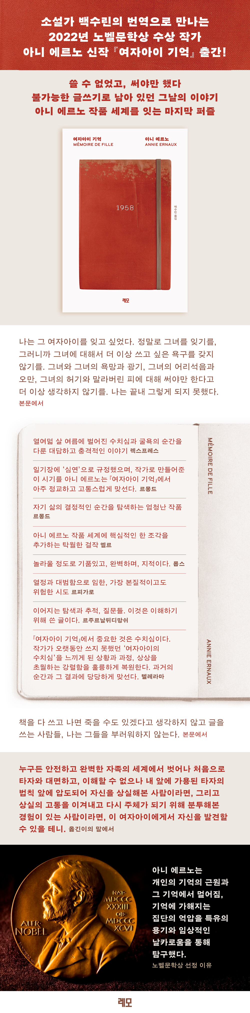 2022년 노벨상 수상 작가 아니 에르노의 2016년 작품, 『여자아이 기억』이 소설가 백수린의 번역으로 출간되었다. 1958년 열여덟 살의 여름에 벌어진 이해할 수 없는 어떤 사건과 그 사건이 불러온 파장들을 작가는 끈질기게 추적한다. 1958년에서 1960년까지 2년의 시간이 자신을 작가로 만들었다고 스스로 일기에서 언급할 정도로 이 사건은 작가로서의 아니 에르노의 삶에 강렬한 흔적을 남겼다.