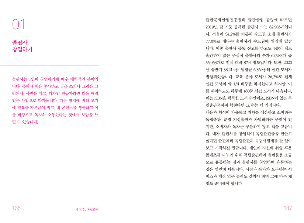 종이책을 사는 사람이 점차 줄어든다지만, 여전히 많은 사람이 내가 가진 이야기를 쓰고 싶어 하고 나만의 독립출판을 꿈꾼다. 다양한 출판 형태 중에 내가 결심하면 바로 책이 될 수 있다는 장점도 있지만, 모든 비용을 직접 부담하고 전 과정을 오롯이 스스로 해내야 하는 독립출판이 많은 인기를 끄는 이유는 하나부터 열까지 나의 정체성을 아낌없이 담아내는 과정에서 얻게 되는 기쁨과 성취감 때문일 것이다. 제목, 표지, 색깔, 폰트, 사진까지 하나하나 나의 취향, 의도, 기분, 관심사, 좋아하는 것, 싫어하는 것까지 모두 반영하여 제작하는 나만의 책은, 독자들에게 내가 만든 책을 선보인다기보다 창작자인 ‘나’ 자체를 보이는 것에 가깝다. 모든 인간은 자신만의 창작 욕구가 있다. 나의 이야기를 처음부터 끝까지 내 손으로, 나답게 완성한다는 것은 창작자에게는 더없이 특별한 일일 것이다. 특별한 에피소드나 극적인 상황이 아니어도 평범한 나의 일상, 내가 공상하는 이야기들을 나를 꼭 빼닮은 한 권의 책으로 엮어보는 것은 어떨까. 사소한 나의 일상도 누군가에겐 공감을, 누군가에겐 위로가 될 수 있다. 그저 나의 취향과 일상에 공감해주는 다양한 사람들의 연결만으로도, 나의 세계가 조금씩 넓어지는 기쁨을 느낄 수 있을 것이다.