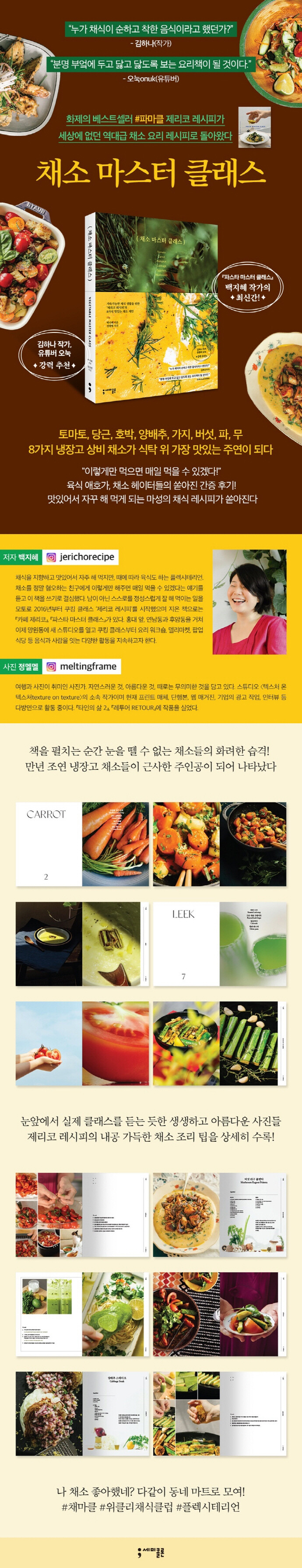 홍대 앞, 연남동, 후암동을 거쳐 망원동에 이르기까지 셀럽과 인플루언서가 먼저 찾는 쿠킹 클래스 열풍의 시초로 유명한 제리코 레시피 백마담. 그녀가 그간 직접 해 먹으며 쌓아온 비건식, 채소 요리의 내공을 모두 담은 ‘채소’ 마스터 클래스로 돌아왔다.