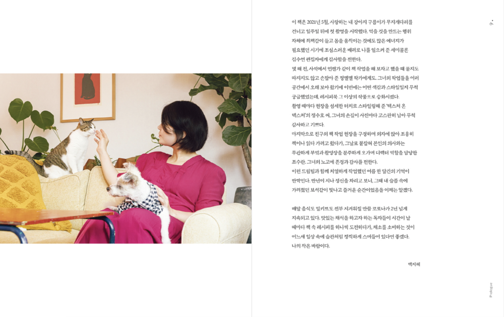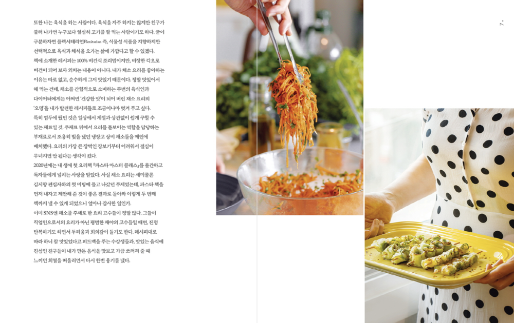 책에 소개한 레시피는 100% 비건식 조리법이지만, 비장한 각오로 비건이 되어 보자 외치는 내용이 아니다. 내가 채소 요리를 좋아하는 이유는 따로 없고, 순수하게 그저 맛있기 때문이다. 정말 맛있어서 해 먹는 건데, 채소를 간헐적으로 소비하는 주변의 육식인과 다이어터에게는 어쩌면 ‘건강한 맛’이 되어 버린 채소 요리의 ‘오명’을 내가 발견한 레시피들로 조금이나마 벗겨 주고 싶다.